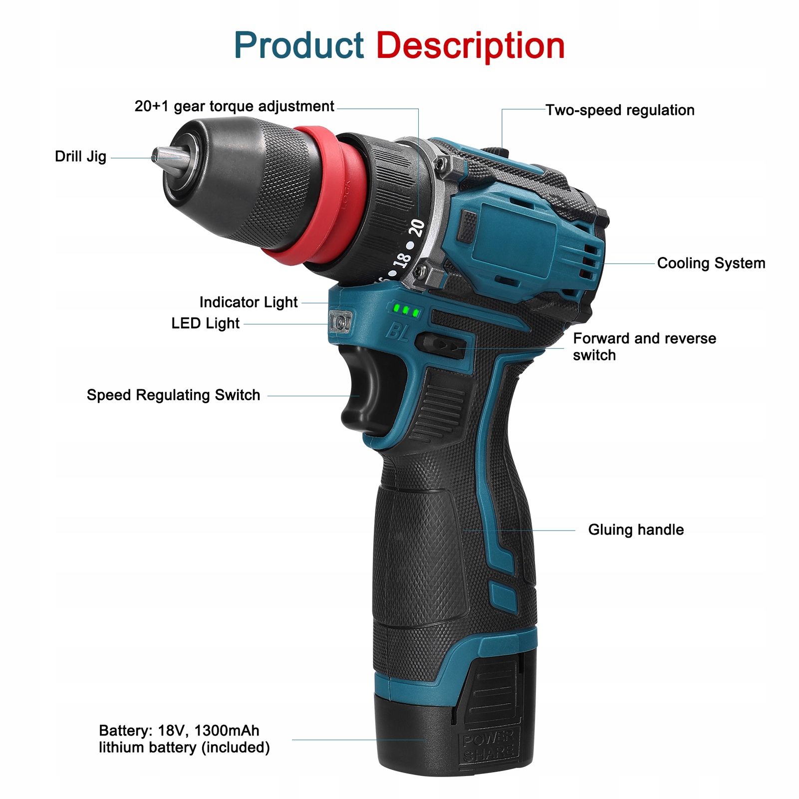 - Цей електроінструмент 18 В 2IN1 поєднує в собі функції електричної викрутки та електричної дрилі. Він не тільки може швидко закручувати або відкручувати гвинти, але також може свердлити отвори в різноманітних матеріалах, забезпечуючи достатню потужність для більшості домашніх або промислових застосувань. Повністю металеві підшипники виготовляються з використанням високовуглецевої сталі та процесу загартування та відпустки для максимальної точності та стабільності, легкого та точного визначення положення. Він пропонує два типи режимів керування швидкістю: 2-швидкісне керування та тригерне стабільне керування швидкістю, що дозволяє досягти бажаної швидкості. Використання електричного шуруповерта може підвищити продуктивність і зменшити втомлюваність і трудовитрати. Цей інструмент підходить для закручування шурупів у різноманітних домашніх сценаріях, включаючи оздоблення будівель, установку побутової техніки, встановлення та обслуговування меблів, обробку деревини своїми руками та інші завдання з розбирання. Крім того, його також можна використовувати для свердління отворів у різних матеріалах, таких як дерево, метал, камінь, бетон тощо.
