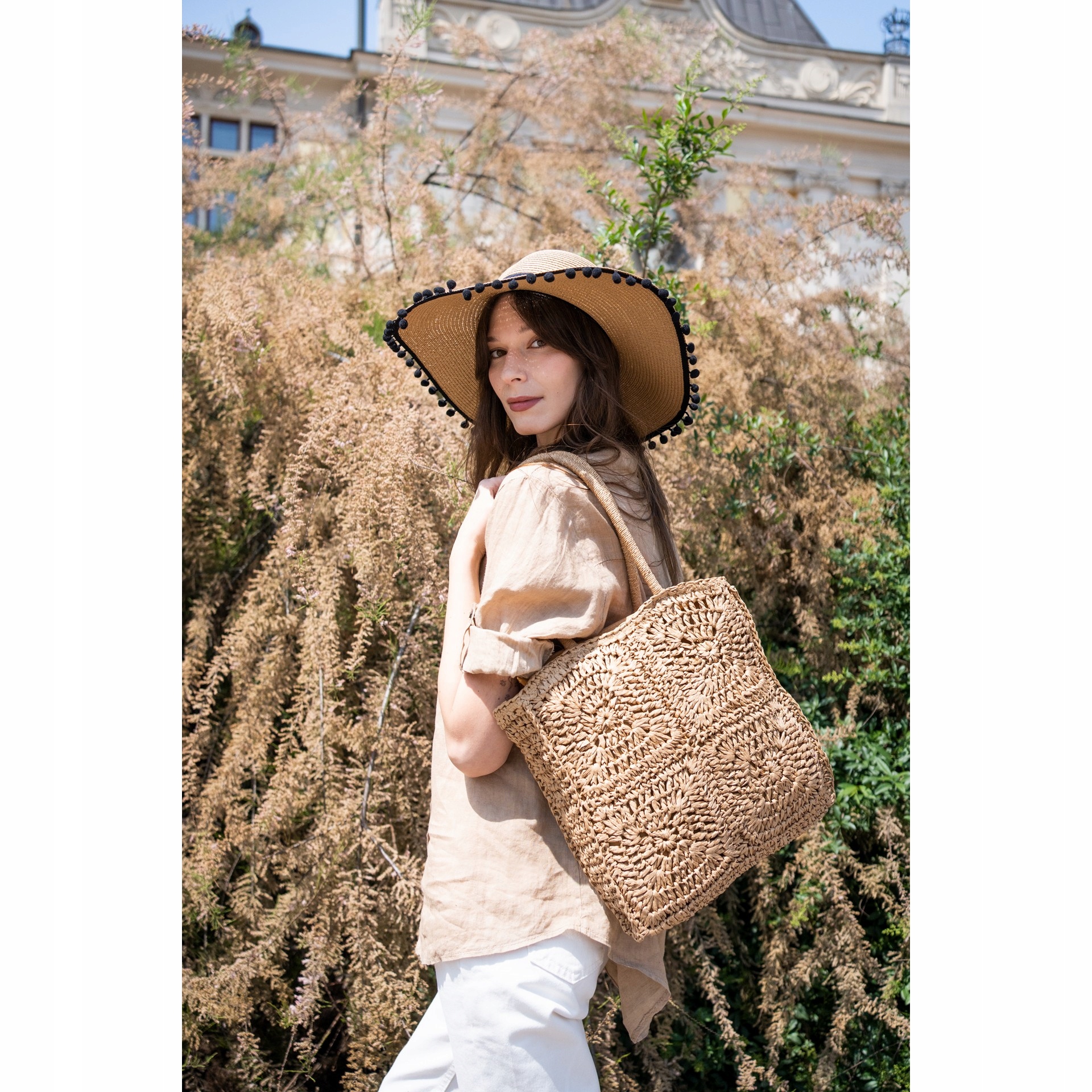 Літня сумка з просоченого паперу, стилізована під кошик з пухким плетінням.