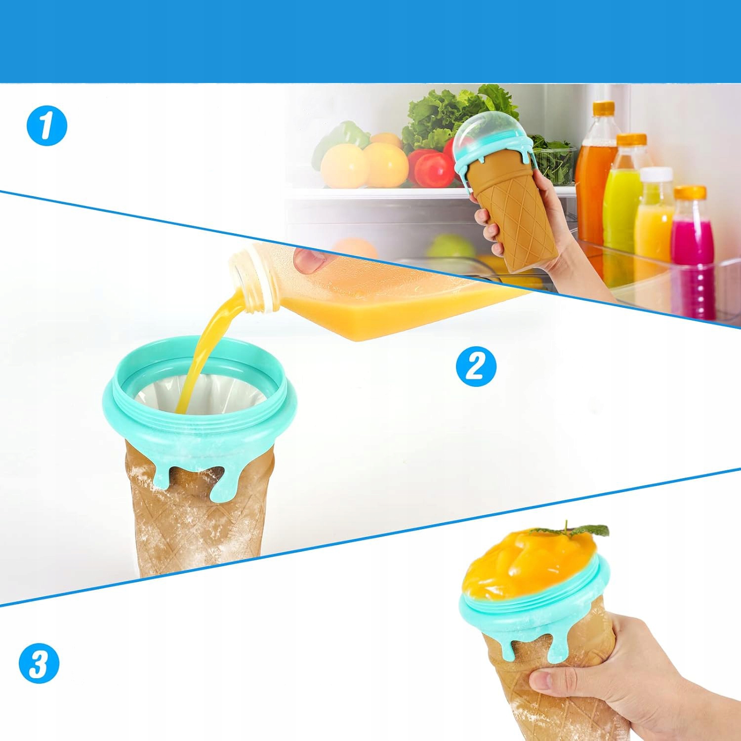 1. Покладіть кружку в пюре на 6 годин у морозильну камеру, поки вона не замерзає. Наповніть напої, які вам подобаються (кількість рідини не повинна перевищувати 2/3 кухольного тіла). Вилийте кришку і вичавіть її на дві хвилини. Тоді ви можете додати фрукти або морозиво і насолоджуватися смачними коктейлями.