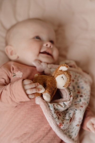 Виготовлений із м’якого приємного матеріалу, який ідеально підходить для обіймів під час гри чи сну. М'яка іграшка з м'яким оленем і мотивами з колекції "Казковий сад" має вузлики, які легко затискаються, і петельку для кріплення соски або прорізувача. Різноманітні виступи-мітки стимулюють почуття малюка дотиками. Ваша дитина завжди може мати його з собою в ліжечку чи колясці.