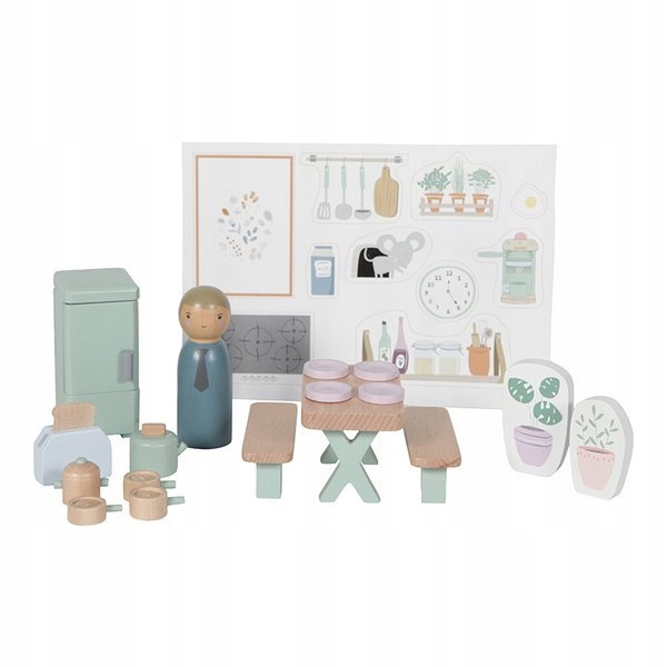 У набір входять: наклейки для самостійного декорування, стіл з лавками, тарілки, каструлі, холодильник, тостер і статуетка. Усі набори Little Dutch можна комбінувати та грати разом.