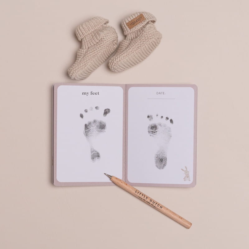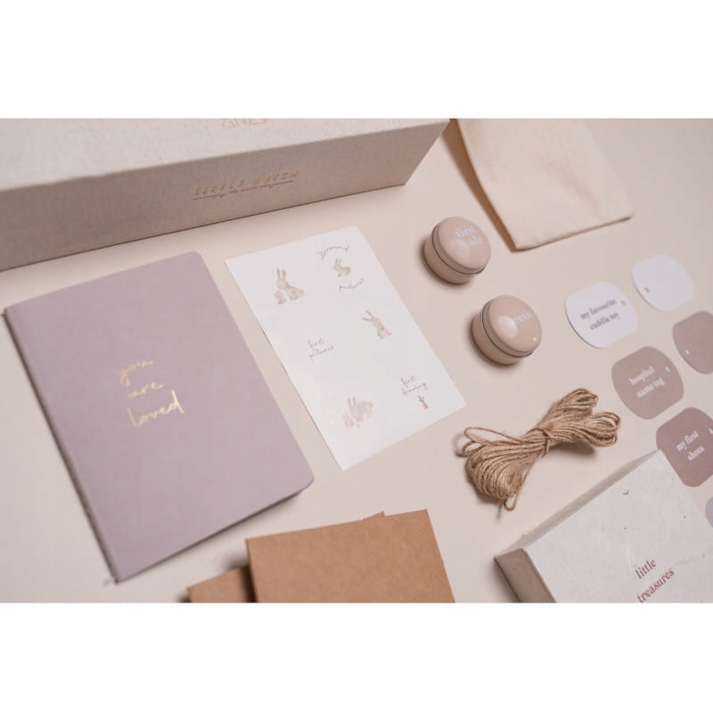 У коробці книга, бирки, джутовий шнурок, конверти, аркуш наклейок, куточки, жерстяна коробка для замка волосся, жерстяна коробочка для першого зубика, коробочка для зберігання маленьких скарбів, мірна стрічка, сумка для зберігання перших повзунків і сумка для зберігання соски.