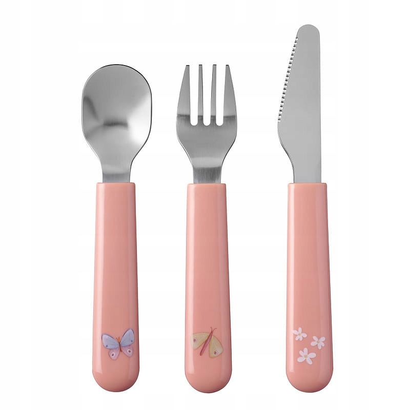 - Набір дитячих столових приборів із трьох предметів складається з виделки, ножа та ложки. Він присвячений дітям 2-3 років, які починають свою пригоду зі столових приборів. Ніж має лише один зубчастий край - він безпечний, але також ефективний, щоб ваш малюк не розчарувався під час різання >