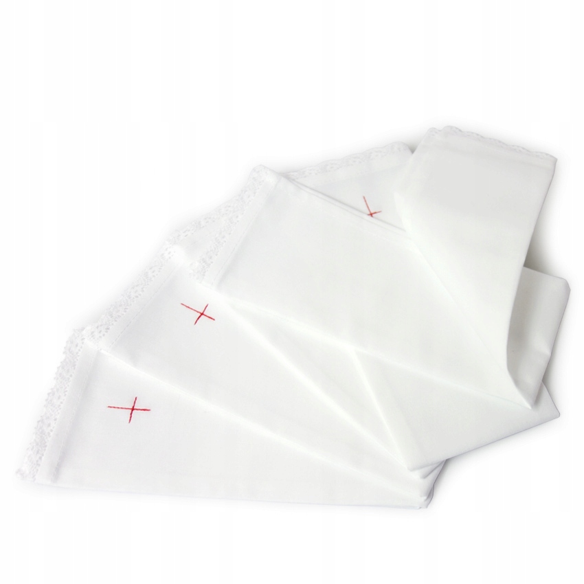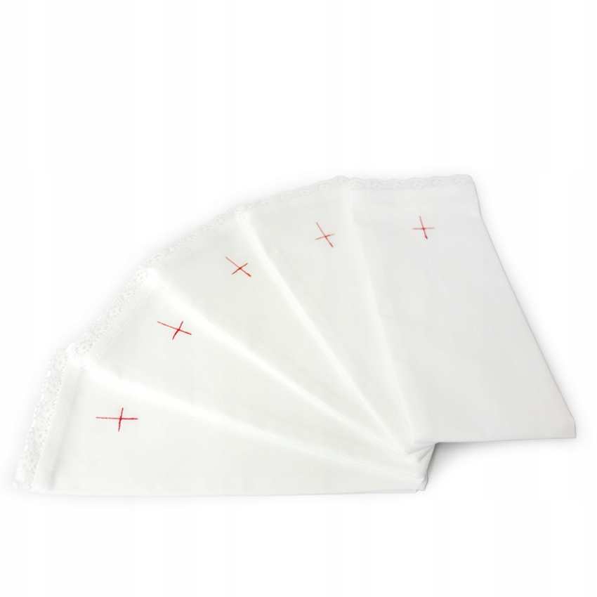 Пурифікатори - для літургійних цілей. Очисники виготовлені з білої бавовняної тканини, розміром 44 х 29 см. Оздоблений білим мереживом з обох сторін. На передній частині кожного очисника вишитий червоний хрест. Наші очисники добре вбирають вологу, м’які та ідеально підходять для очищення літургійного посуду. У наборі 5 штук