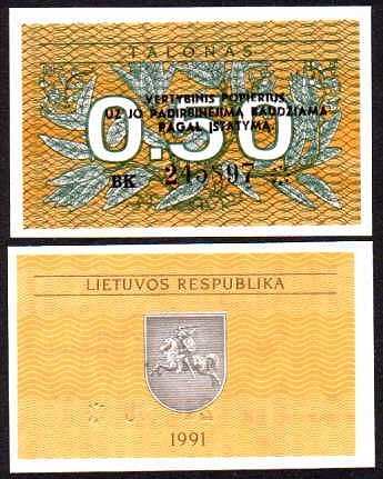 ЛИТВА, 0.50 TALONAS 1991 Pick 31b
