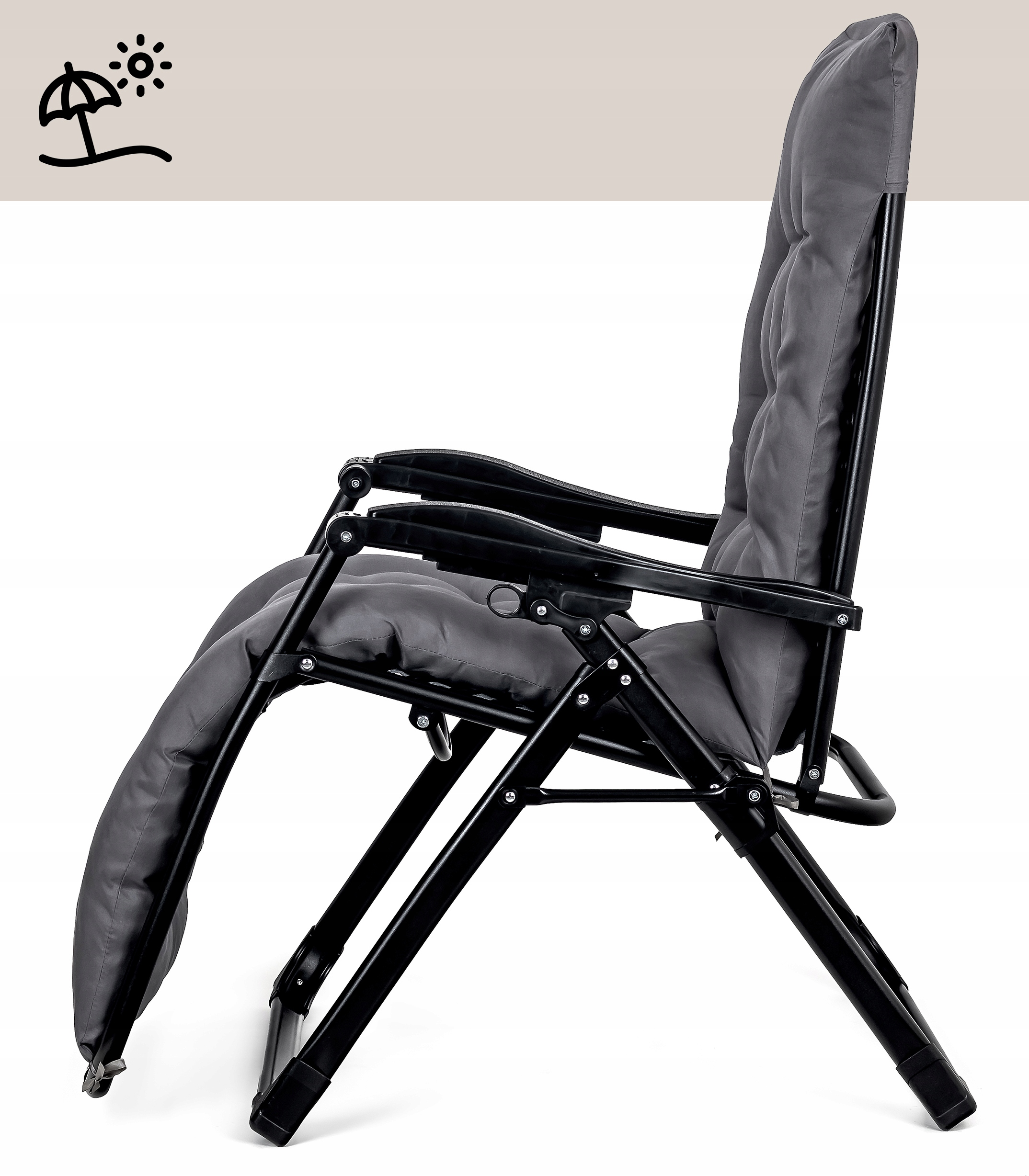 - Продукт має гладке регулювання положення та спеціальний замок, який захистить користувача від небажаної зміни положення шезлонгу. Всі металеві елементи були намальовані методом порошку, який захистить шезлонг від корозії.