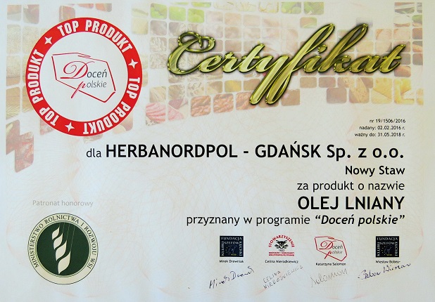 - Смак і якість олії були оцінені програмою «Оцініть польське» під патронатом Міністерства сільського господарства.