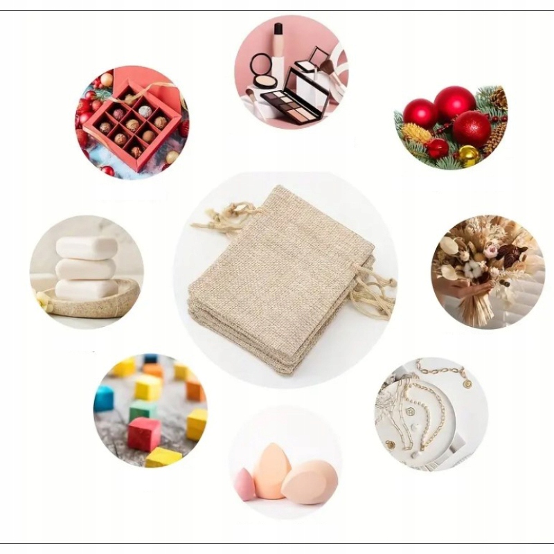 - Джутові мішки 30 шт.: в набір входить 30 мішків розміром 10х14 см. Можна використовувати як подарункову упаковку, парфумерну сумку, прикрасу столу, гірлянду та підвіску на ялинку.