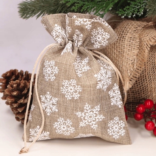 Подарункова сумка з льону з принтом білої сніжинки. Сумка має шнурок, завдяки якому її вміст завжди буде на місці.