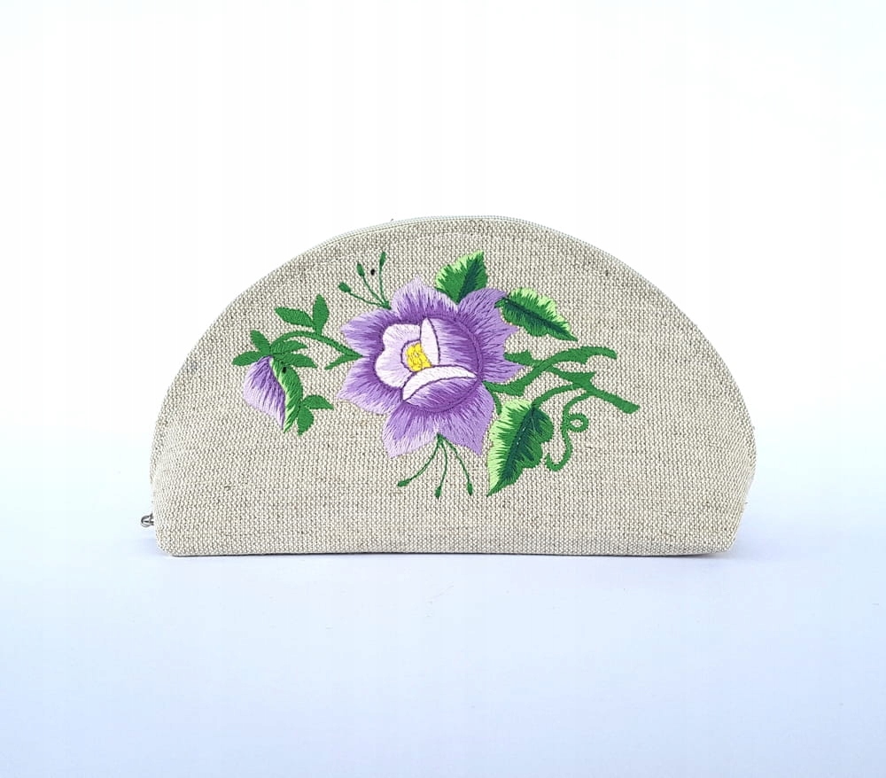 Елегантна лляна косметичка, прикрашена вишивкою Łowicz з фіолетовою трояндою.