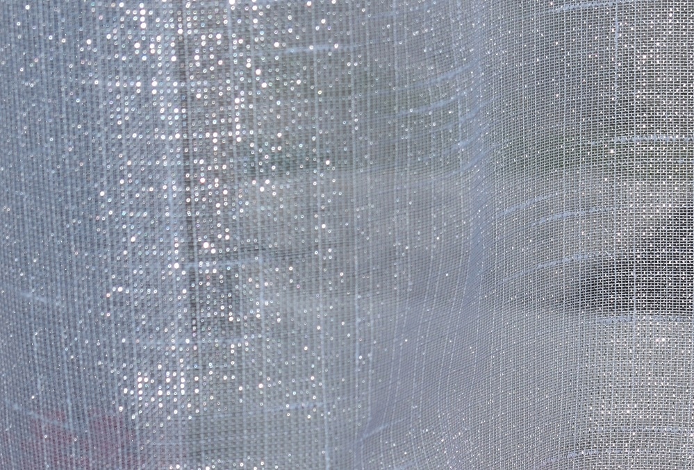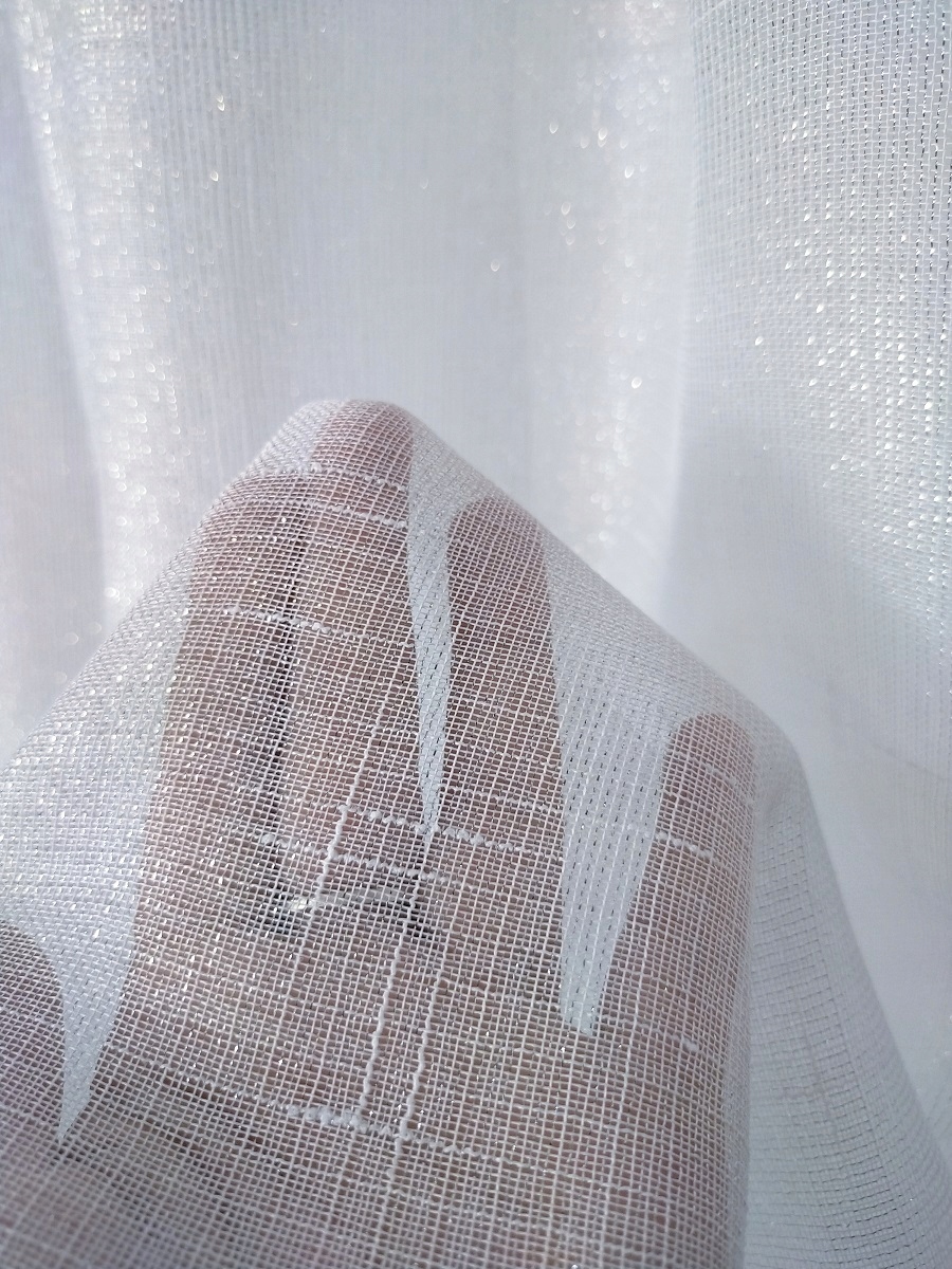 окрім білої нитки по черзі вплетена срібляста мерехтлива нитка в, що змушує тканину чарівно сяяти, підвищуючи її естетичну цінність.