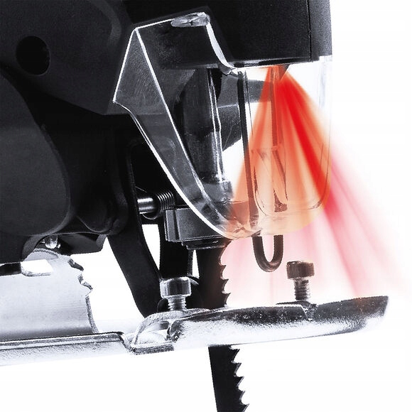 - Лобзик оснащений лазерним напрямком пилкового полотна, що дозволяє дуже точно працювати з пристроєм.