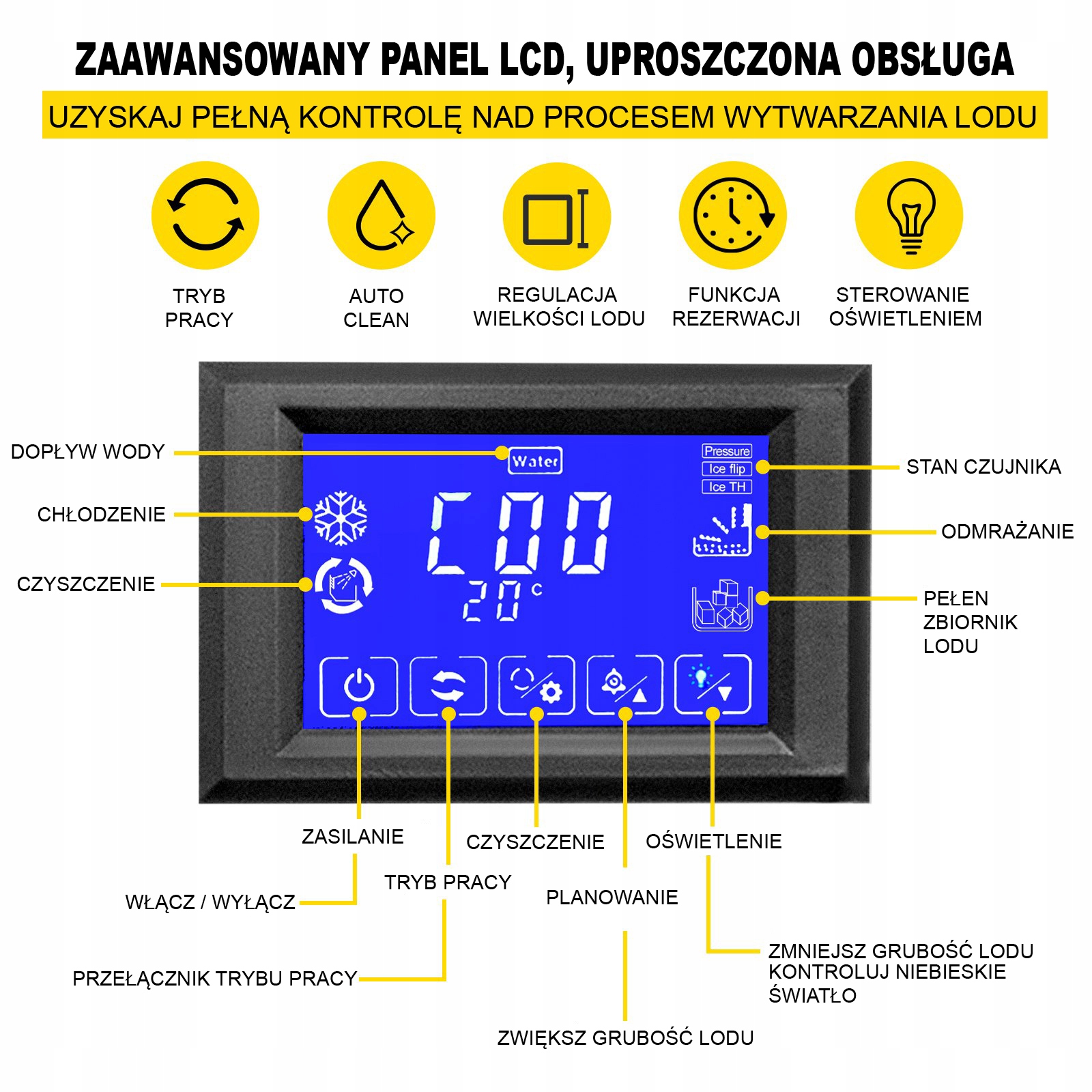 Льодогенератор можна очистити автоматично (протягом 30 хвилин) одним натисканням, заощаджуючи час і зусилля. Він використовує блакитне світло NANO, яке допомагає освітлити внутрішню частину та є ефективним під час стерилізації.