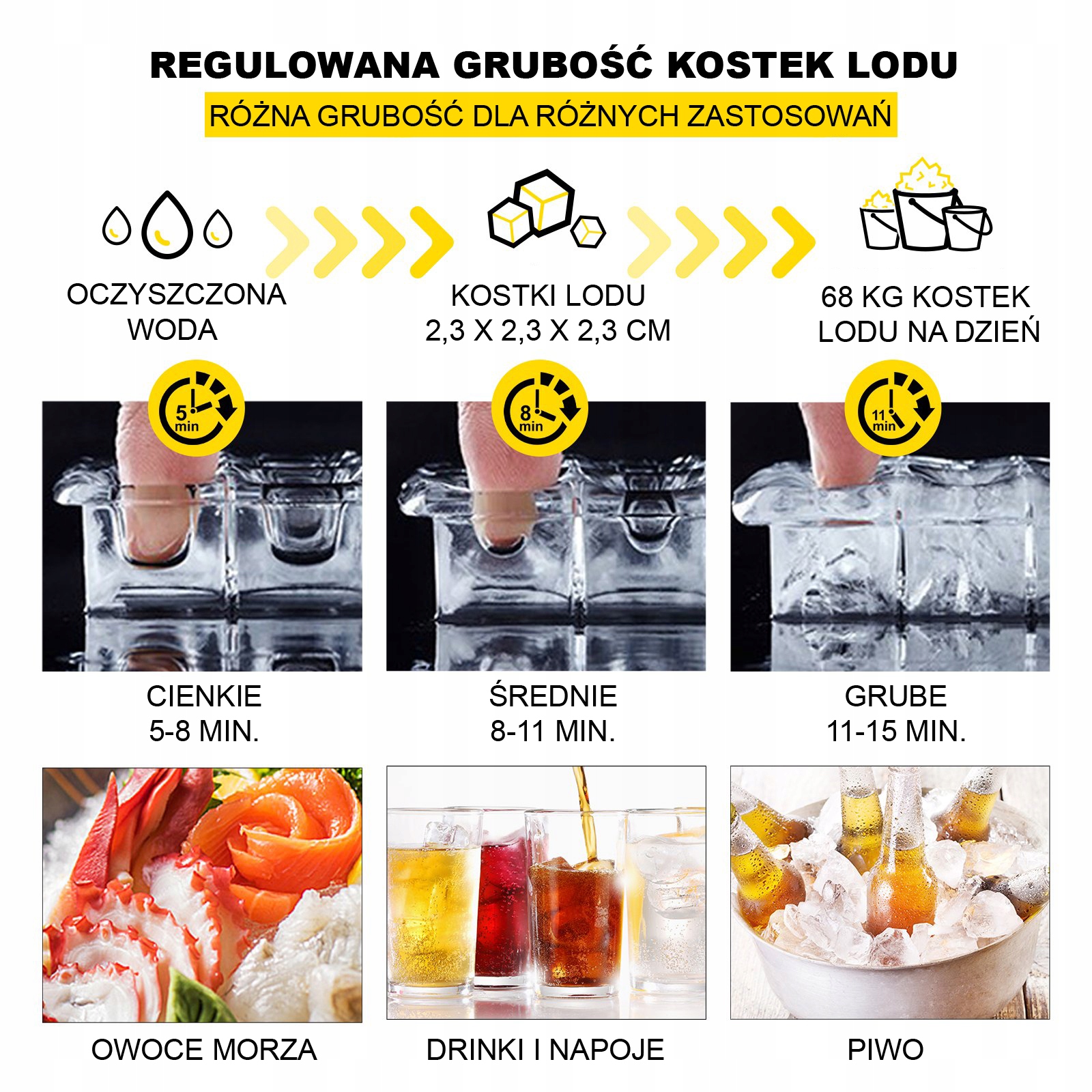 З сітчастим лотком для льоду 45 шт. (5 x 9) ) (розміри льоду: 23 x 23 x 23 мм), який здатний виробляти до 68 кг вишуканих кристально чистих кубиків льоду кожні 24 години. Товщину кубиків льоду можна вільно регулювати відповідно до фактичних потреб.