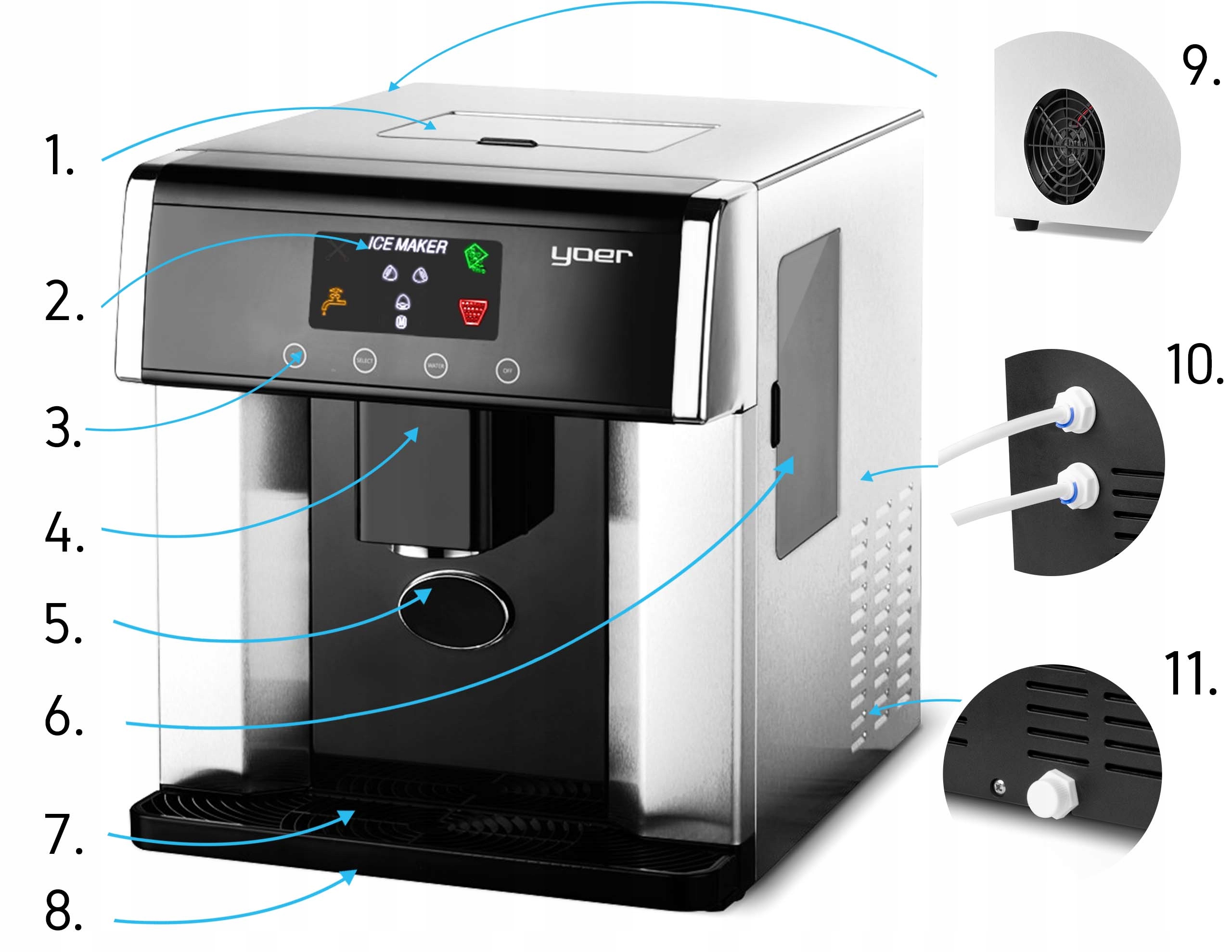 1️⃣ Перемикач льодогенератора - УВІМКНЕНО - натисніть, щоб увімкнути пристрій,