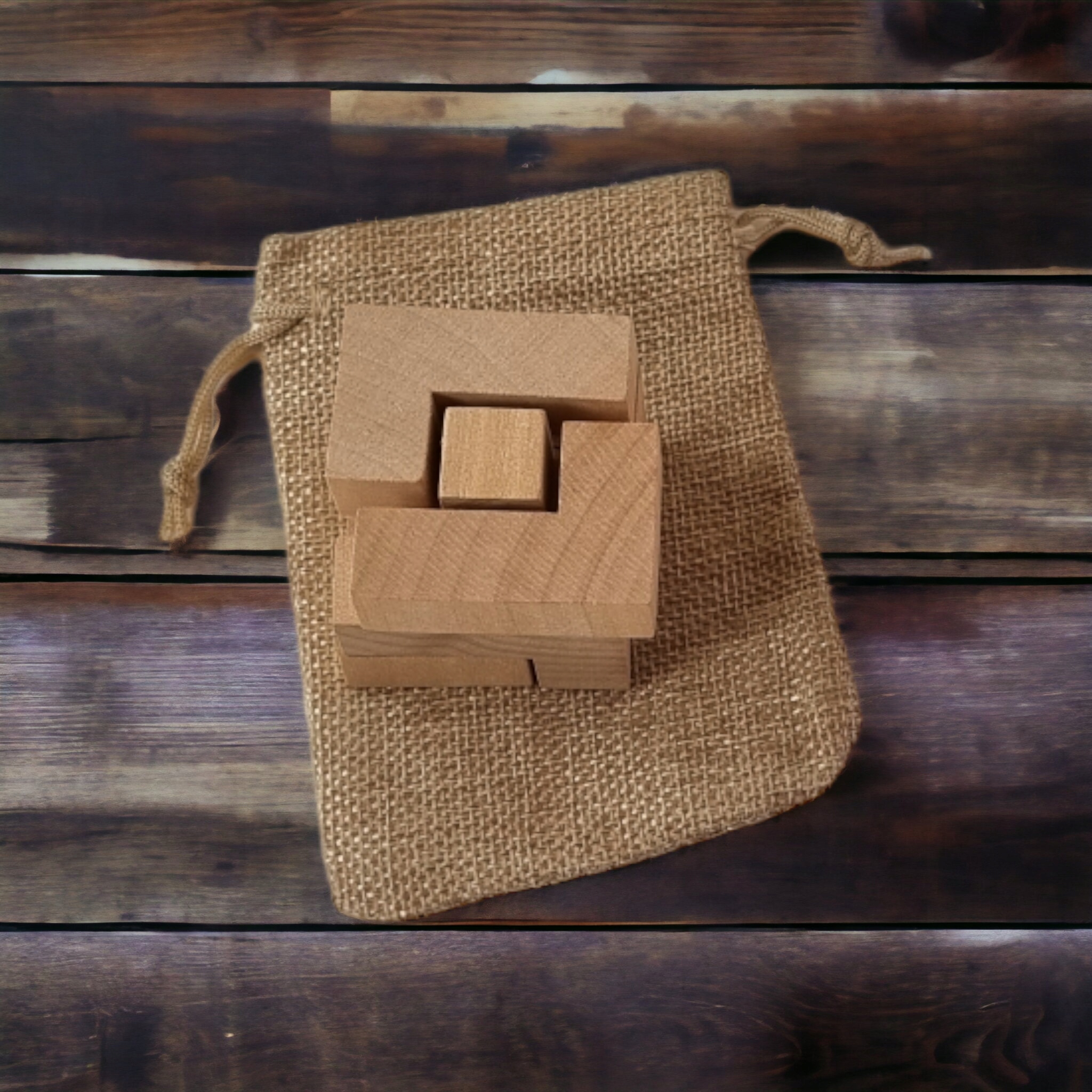 Міні-тетріс 3D - завдання зібрати куб із семи різних елементів. Елементи виготовлені з міцної деревини, що гарантує довговічність і тривалість розваг. До кубика додається високоякісний коричневий джутовий мішок.