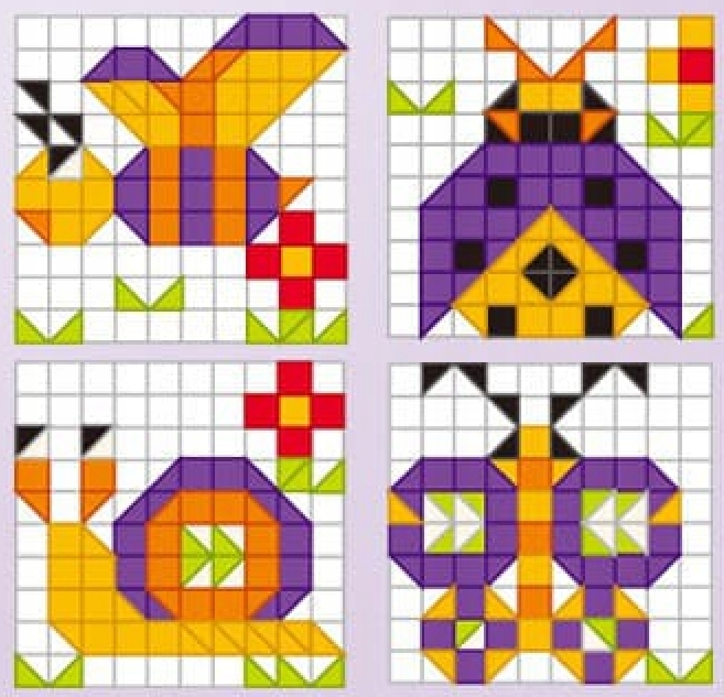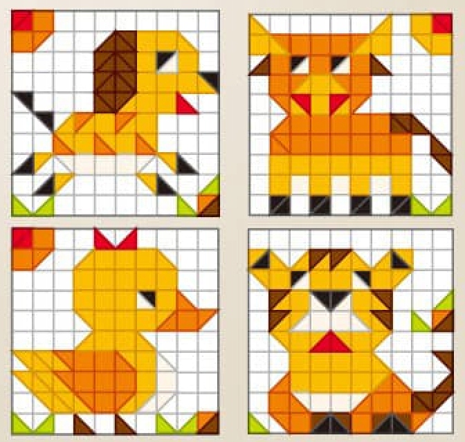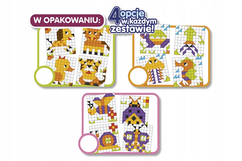 Набір включає 4 різні візерунки для розташування, що дозволяє тривати розважатись та експериментувати з різними домовленостями. Набір також містить спеціальну плитку , на якій дитина може влаштувати свої твори, та 4 кадри , які дозволяють обрамляти створені зображення. Крім того, власник зображення дозволяє створити прикрасу, яке можна повішити в дитячій кімнаті.