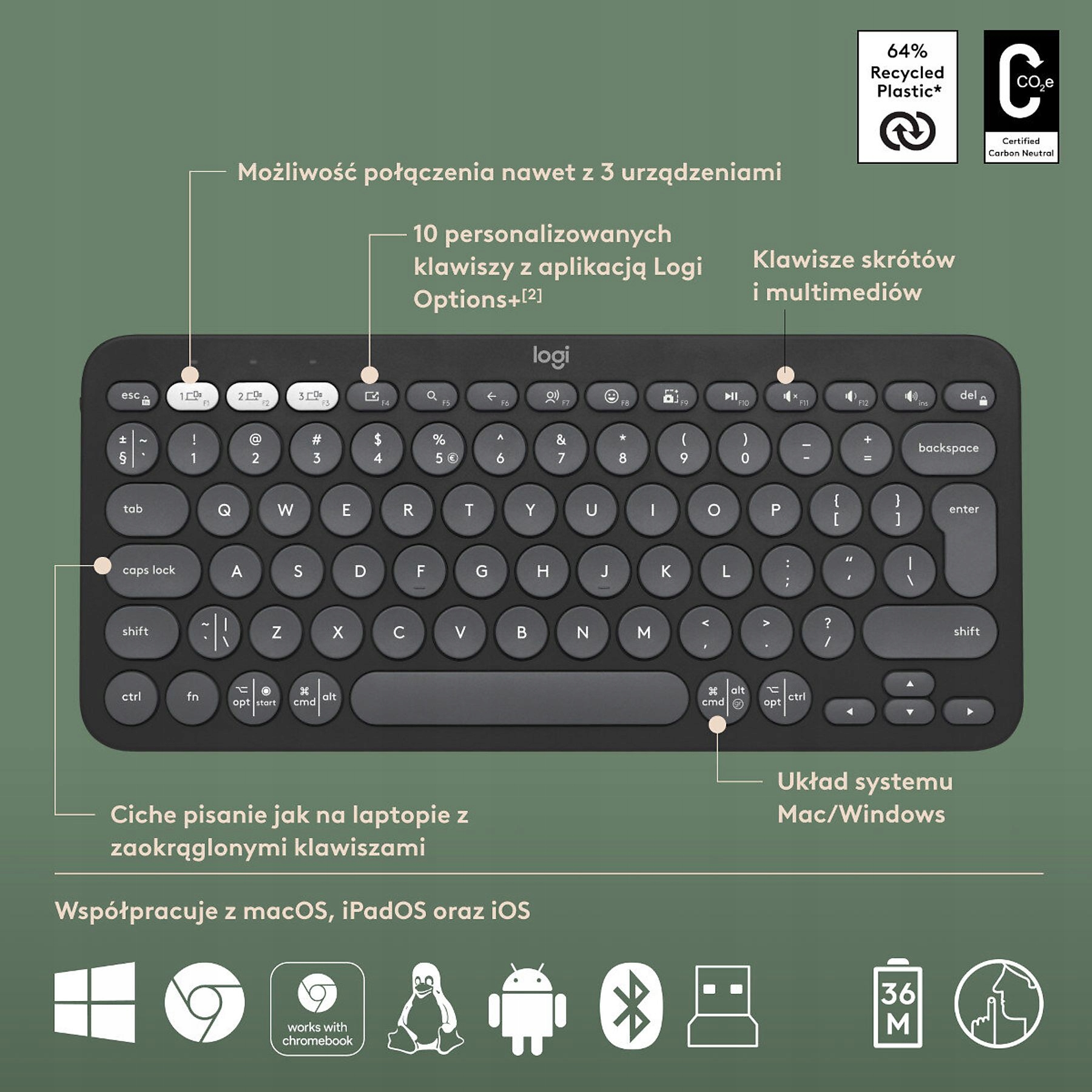 Клавіатура оснащена функцією Easy-Switch, яка дозволяє плавно перемикатися між трьома запрограмованими пристроями за допомогою однієї клавіші. У миші є спеціальне місце для USB-приймача, захищене магнітною застібкою. Клавіатура пропонує користувачеві 10 настроюваних клавіш Fn, які можна призначити відповідно до ваших уподобань. Також використовуйте практичні комбінації клавіш, такі як функції пошуку, знімки екрана та керування музикою.