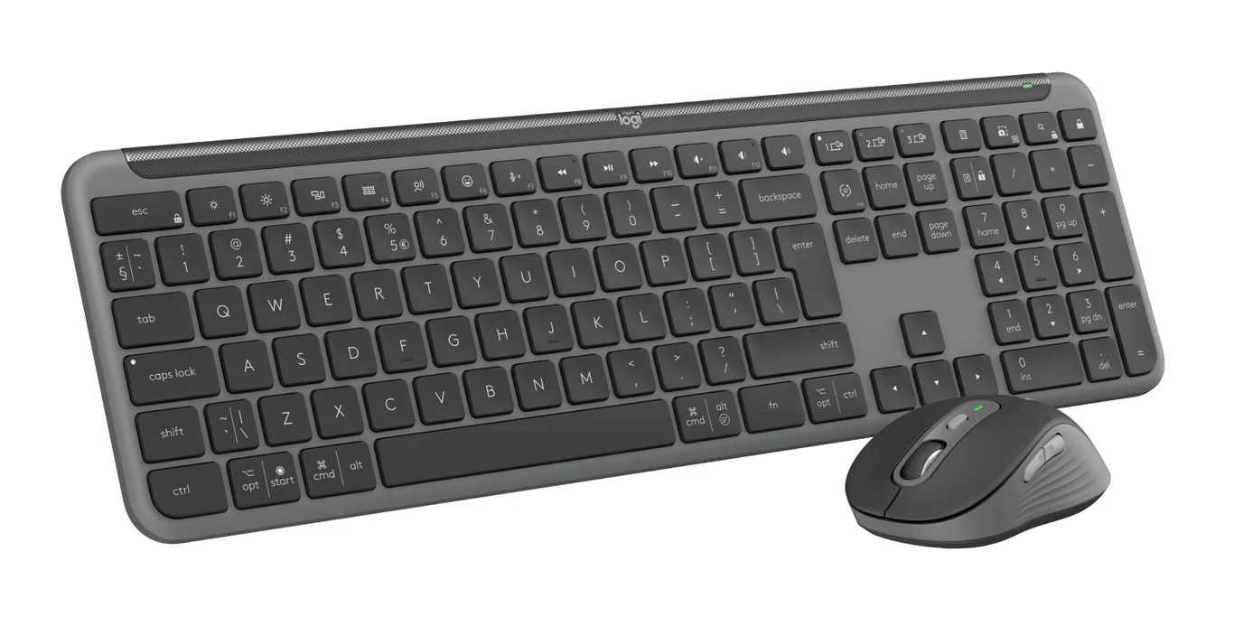 Logitech Signature Slim Combo MK950. Розмір клавіатури: повний розмір (100%). Стиль клавіатури: простий. Технологія підключення: Бездротовий, Інтерфейс пристрою: RF Wireless + Bluetooth, Тип клавіатури: Ножичний перемикач, Розкладка клавіатури: QWERTY, Кількість клавіш: 108, Рекомендоване використання: Office. Колір продукту: Графіт. Миша включена