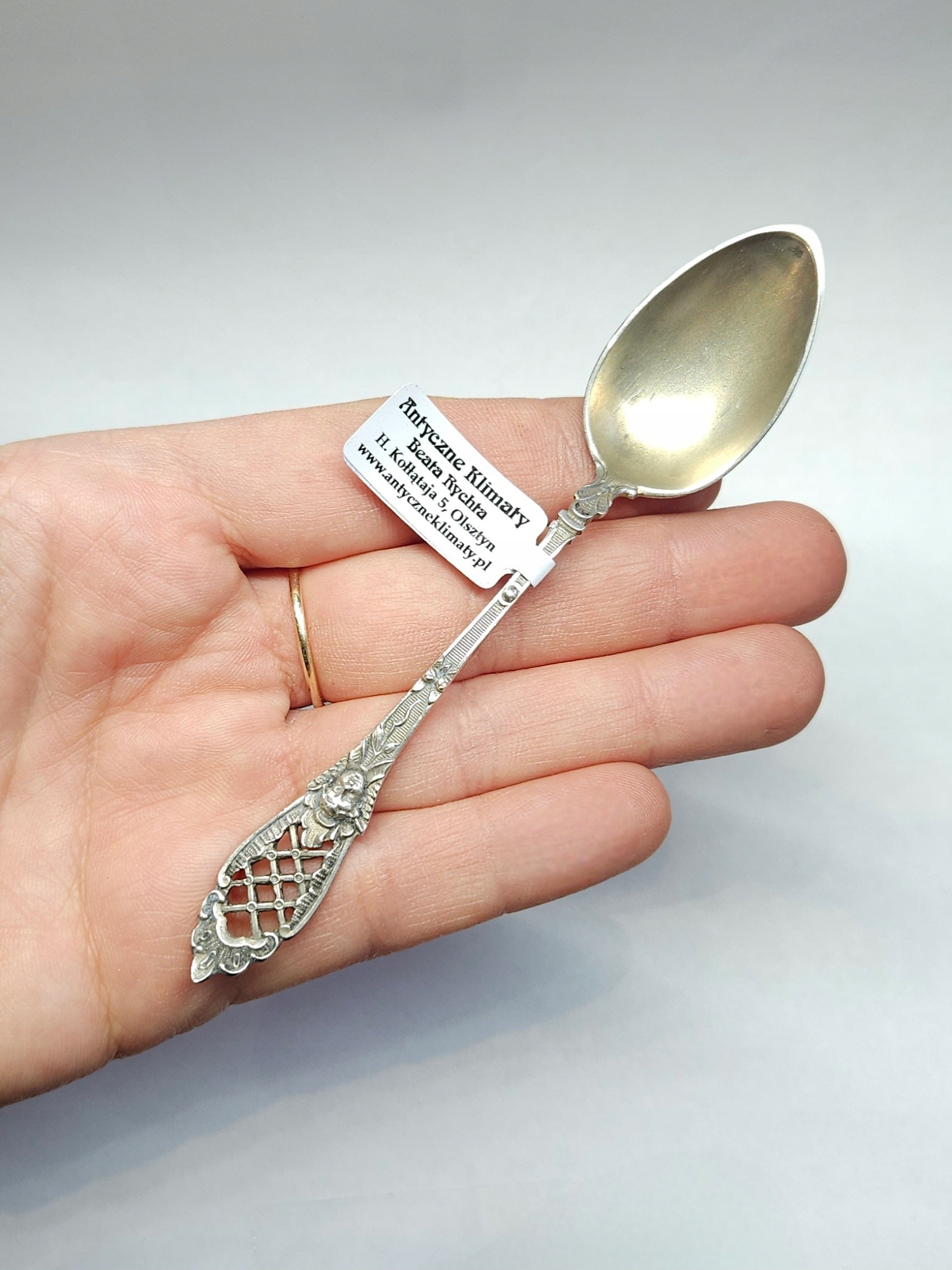 Ложка срібна з атласним блиском, з ребристою ручкою, прикрашена бароковим мотивом путто та ажурною сіткою; Через вік можливі дрібні мікроподряпини та локальне потемніння срібла