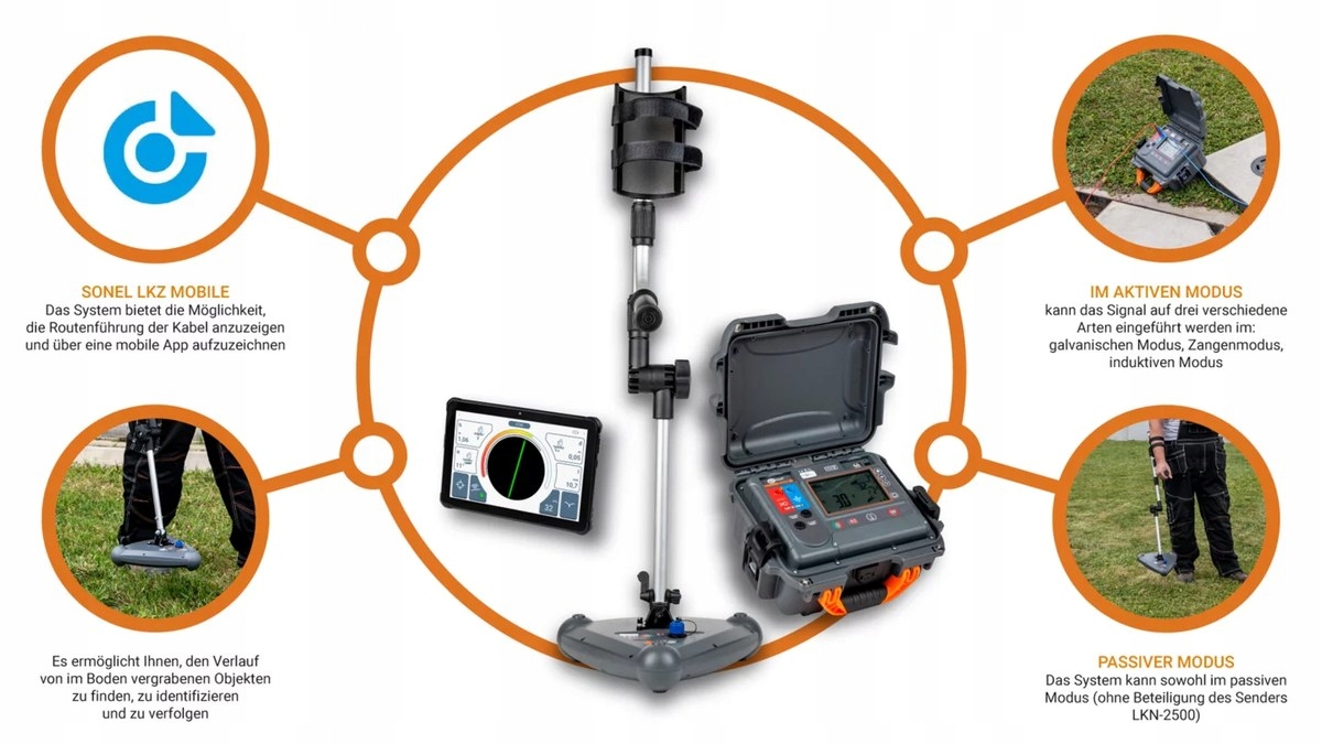 Набір для визначення місцезнаходження LKZ складається з передавача LKN і детектора LKD. Він дозволяє знаходити, ідентифікувати та відслідковувати місцезнаходження предметів, заритих у землю. Користувач зможе прокласти: силові та контрольні дроти та кабелі. Комплекти серії LKZ є безцінною підтримкою для земляних робіт в енергетичній, монтажній, будівельній, залізничній, телекомунікаційній, водопровідній та санітарній промисловості, опаленні, геодезії та багатьох інших галузях. Передавач ЛКН-2500 використовується для подачі сигналу про локацію на маршрутизований об'єкт. Детектор LKD-2500, розміщений уздовж досліджуваного об'єкта, виявляє сигнал і інформує про це користувача через мобільний додаток Sonel LKZ Mobile. Визначення маршруту об'єкта можливо за спостереженнями за показаннями компаса та рівнем виявленого сигналу. У системі є можливість прокладати кабелі та записувати маршрути за допомогою мобільного додатку. Такі файли можна експортувати та робити доступними для інших користувачів, а також для тих, хто не має пристрою LKN-2500 / LKD-2500. Система здатна працювати в пасивному режимі (без передавача ЛКН-2500) і активному режимі (з передавачем ЛКН-2500). Активний режим дозволяє вводити сигнал трьома різними способами: гальванічний - передбачає подачу сигналу на об'єкт гальванічно, за допомогою проводів, затискач - передбачає подачу сигналу на об'єкт індуктивним шляхом, за допомогою затискачів, індуктивний - передбачає подачу сигналу на об'єкт індуктивним шляхом, за допомогою внутрішньої антени пристрою. ІТ та телекомунікації, підземні елементи установок блискавкозахисту, установки катодного захисту, установки водопостачання та каналізації, установки палива та транспортування (газопроводи, трубопроводи), установки опалення та попередньо ізольовані труби. У набір входить передавач, детектор, панель керування та довга ручка, коротка ручка не входить (опція)