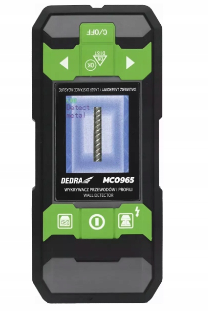 - Детектор проводів і профілів DEDRA MC0965 дозволяє виявляти металеві елементи та профілі, електричні кабелі без або під змінною напругою, деревину, а також інші об’єкти, такі як залізо, бетон, скло, алюміній тощо.