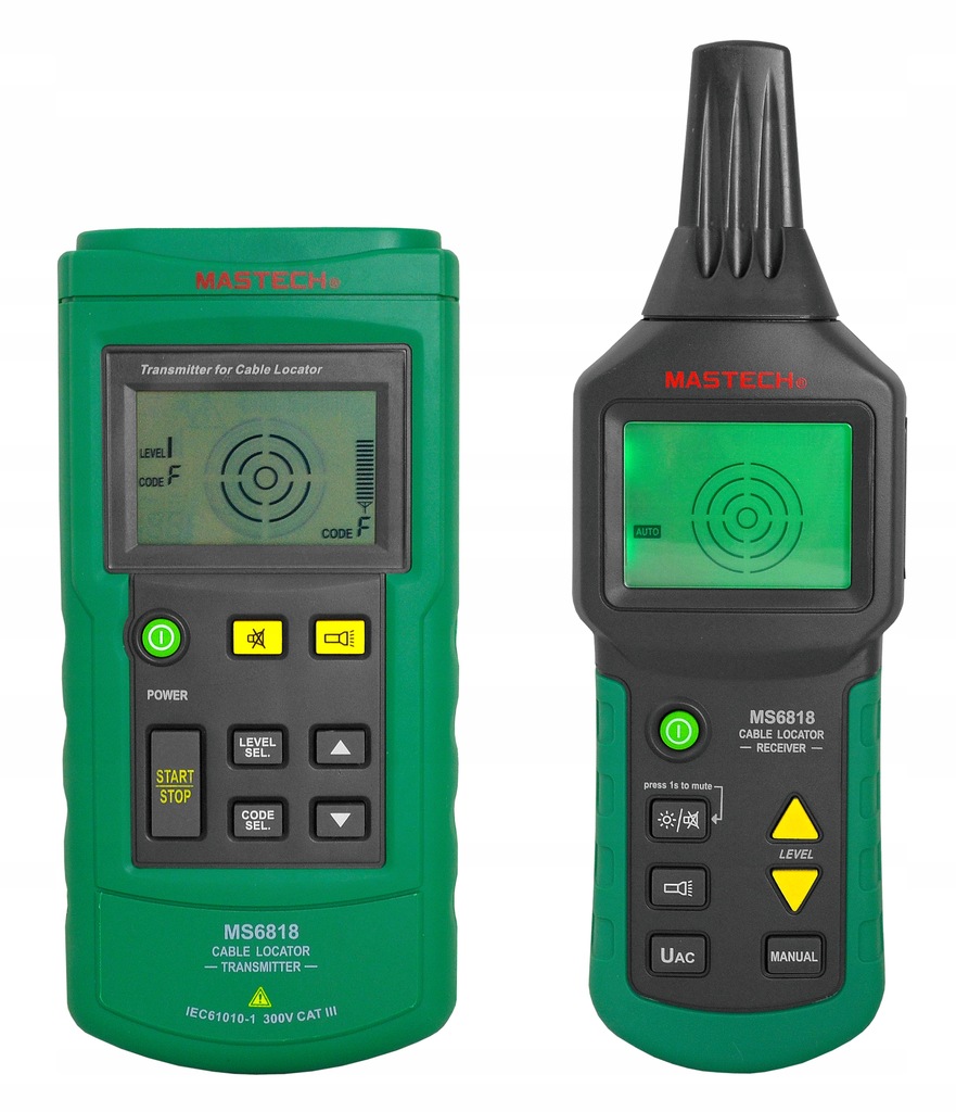 Пристрій Mastech MS6818 ідеально підходить для пошуку кабелів у стінах, підлозі та під землею. Завдяки цьому ви можете швидко знайти запобіжники (вимикачі) і призначити їх певним ланцюгам. За допомогою локатора MS6818 ви можете легко знайти пошкодження (обриви, короткі замикання) у вбудованих кабелях, напр. системи теплої підлоги. Він також легко виявляє дроти та труби під напругою.