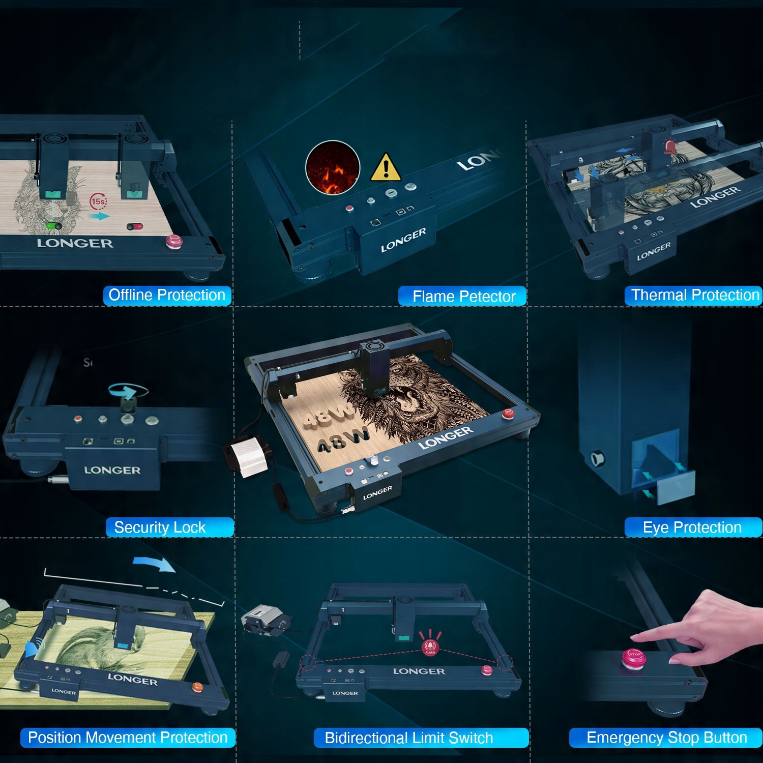Longer Laser B1 має 8 функцій безпеки, а саме рух/полум’я/вимкнення/стаціонарне/блокування/захист очей/кнопка аварійної зупинки/нуль. скинути. Лазерна головка автоматично повертається до нуля, щоб уникнути вигоряння під час розпалювання