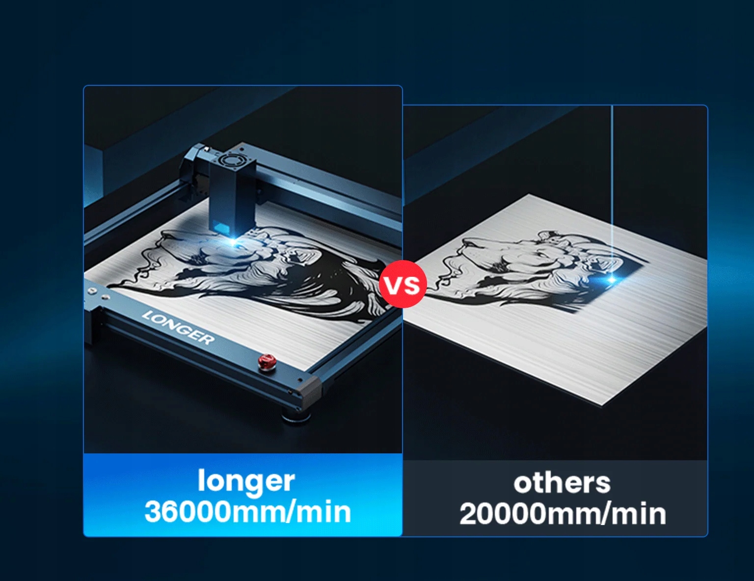 Лазер B1 оснащено новою 32-розрядною материнською платою, яка забезпечує швидкість гравіювання до 36 000 мм/хв, що в чотири рази швидше, ніж прості лазерні гравери. Крім того, тихі контролери TMC2209 ефективно зменшують шум під час роботи, роблячи роботу приємнішою.