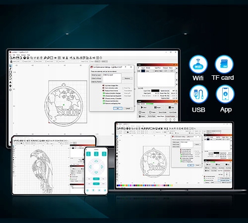 сумісний із LaserGRBL, LightBurn і підтримує Windows 7+, macOS і Linux.