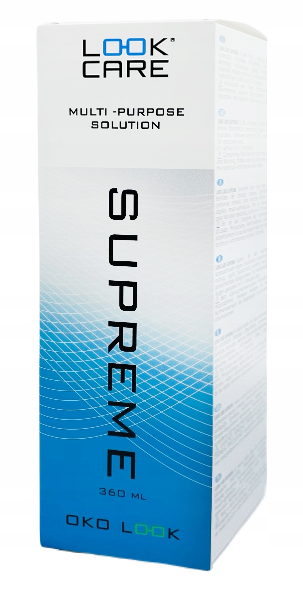 Однорідний розчин Look Care Supreme, завдяки синергії між активними факторами та інноваційними інгредієнтами, характеризується сильним дезінфікуючим, захисним та консервуючим ефектом. Це ізотонічний і постійний водний розчин по відношенню до клітин ока, тому він біологічно толерантний також у випадку дуже чутливих очей. Підтверджені очищаючі та міколітичні властивості роблять лінзи дуже зволоженими як одразу після нанесення, так і протягом усього дня, що значно покращує комфорт.