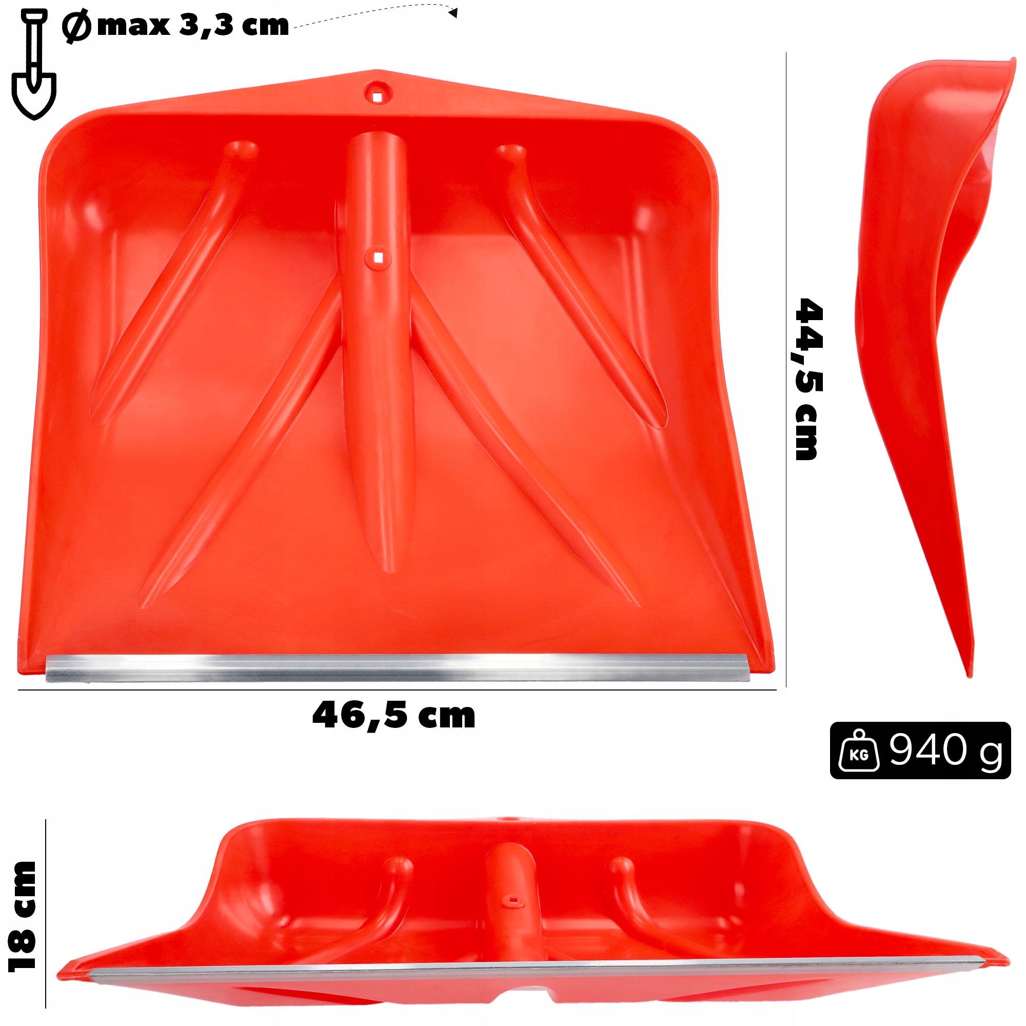 Снігоприбиральна лопата розміром 46,5 х 44,5 см — це міцний професійний інструмент із високоякісного пластику. Лопата посилена фурнітурою з алюмінієвого профілю, що запобігає іржавінню і гарантує успішну роботу навіть при роботі з більш важкими матеріалами. Наш продукт стійкий до негативних температур і морозу. Крім того, завдяки своїм властивостям він міцний, стійкий до розтріскування та готовий до тривалого використання.