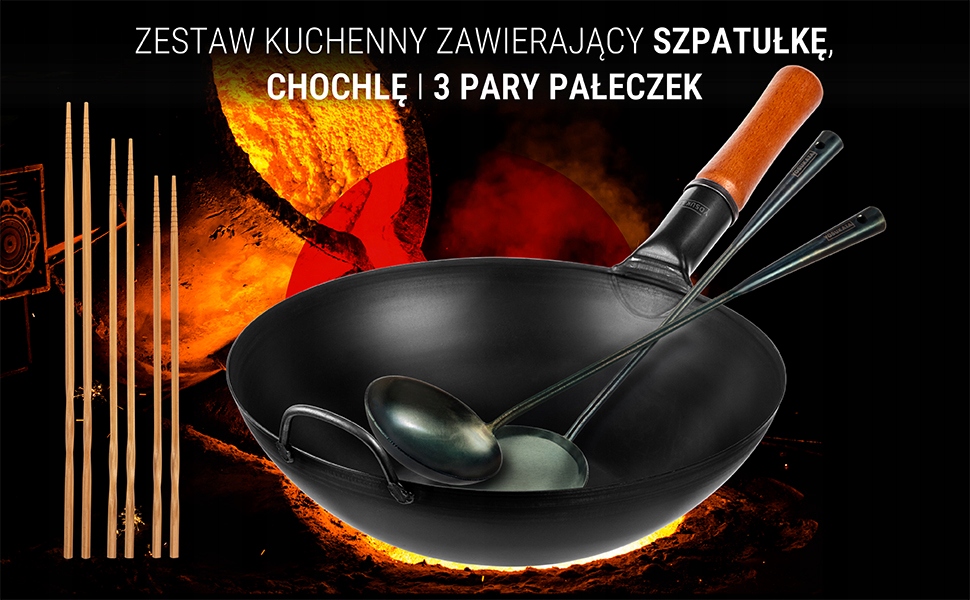 Набір містить 43-сантиметрову витриману лопатку та ополоник із вуглецевої сталі та 3 пари бамбукових паличок з довжиною 33 см, 36 см і 30 см.