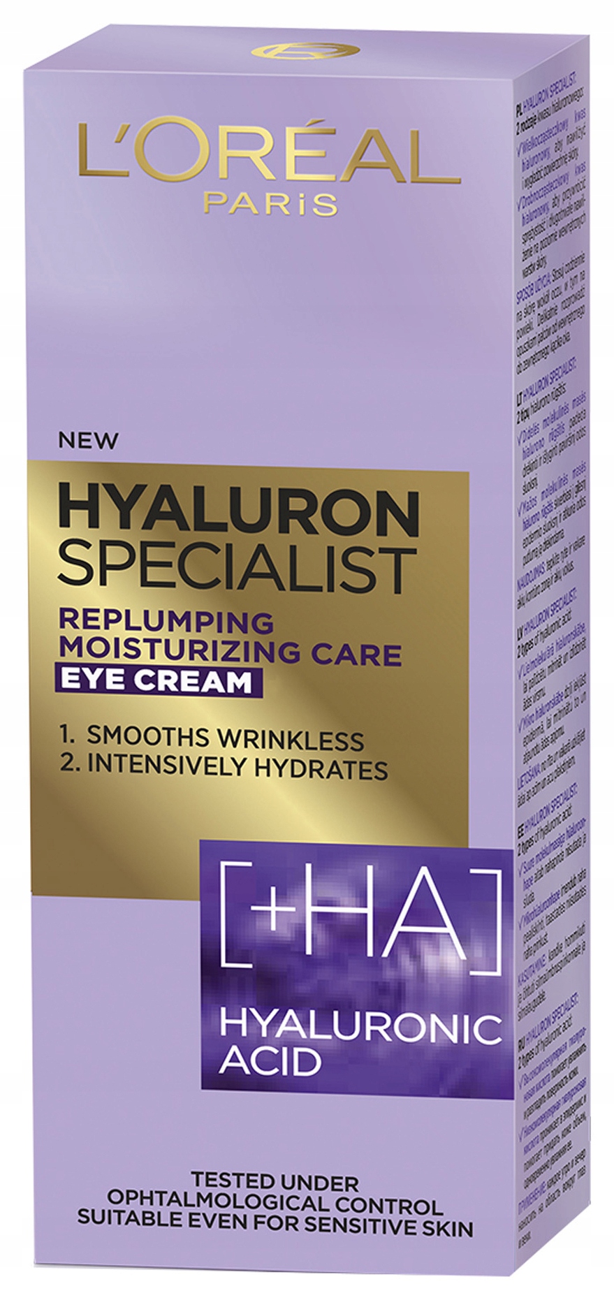 HYALURON SPECIALIST EYE CREAM від L'Oréal. Крем для очей. Має легку та приємну консистенцію, яка швидко вбирається та не залишає жирної плівки. Призначений для всіх типів шкіри, включаючи чутливу. Має інноваційну формулу, збагачену двома видами гіалуронової кислоти високої концентрації. Ефективно та помітно розгладжує зморшки та допомагає позбутися так званих гусячих лапок. Водночас інтенсивно зволожує, розгладжує та відновлює пружність та еластичність шкіри. Доступний у ємності 15 мл.