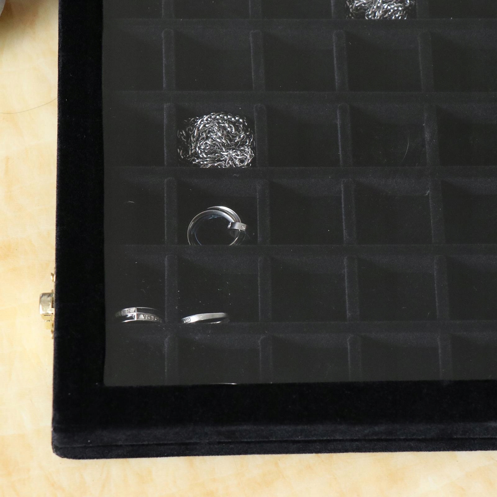 Виготовлений із міцної композитної дошки, загорнутої у високоякісну оксамитову тканину, зі знімними відділеннями та скляною кришкою для впорядкування та захисту прикрас і аксесуарів.