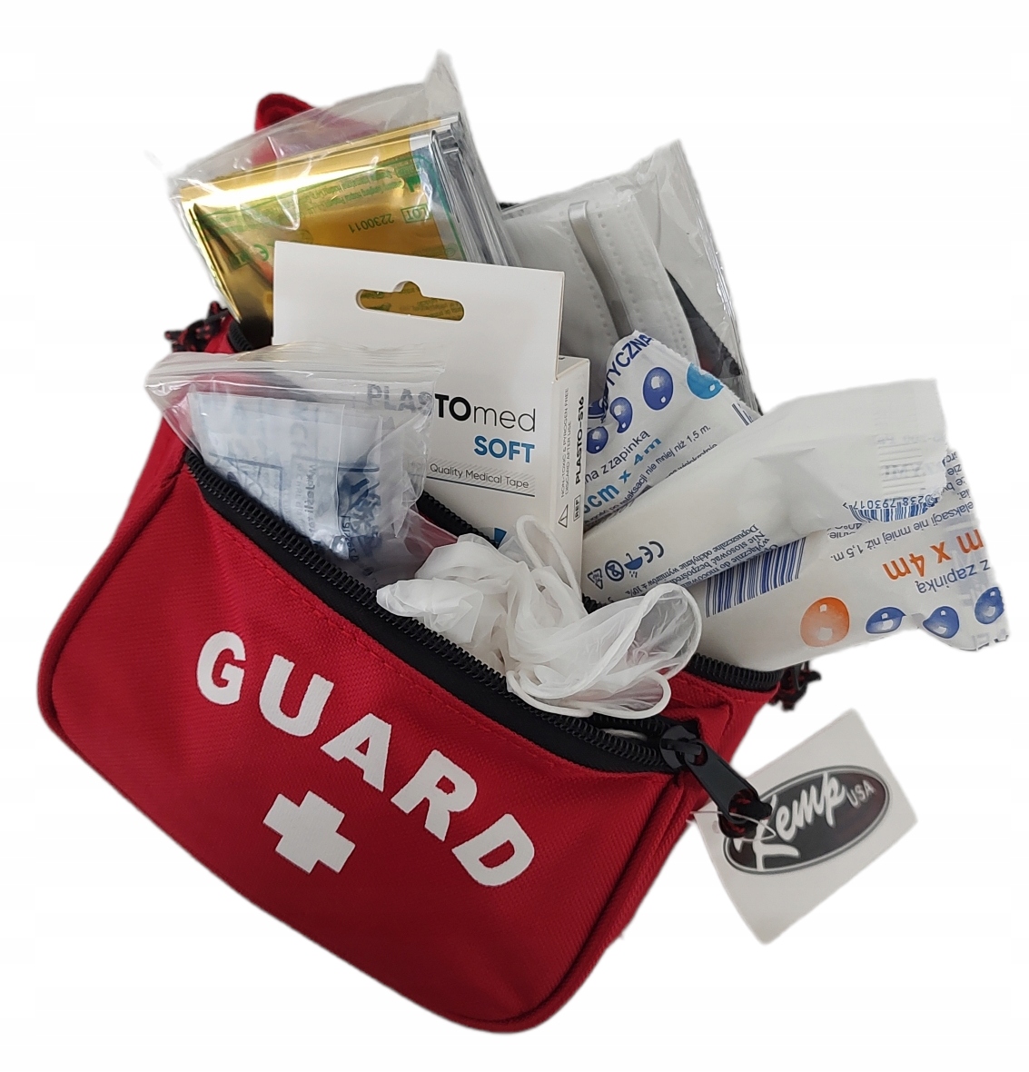 Елементи рятувального танка дозволяють отримати ефективну першу допомогу. Сумка містить три водонепроникні кишені на блискавці та регульований ремінь стегна.
