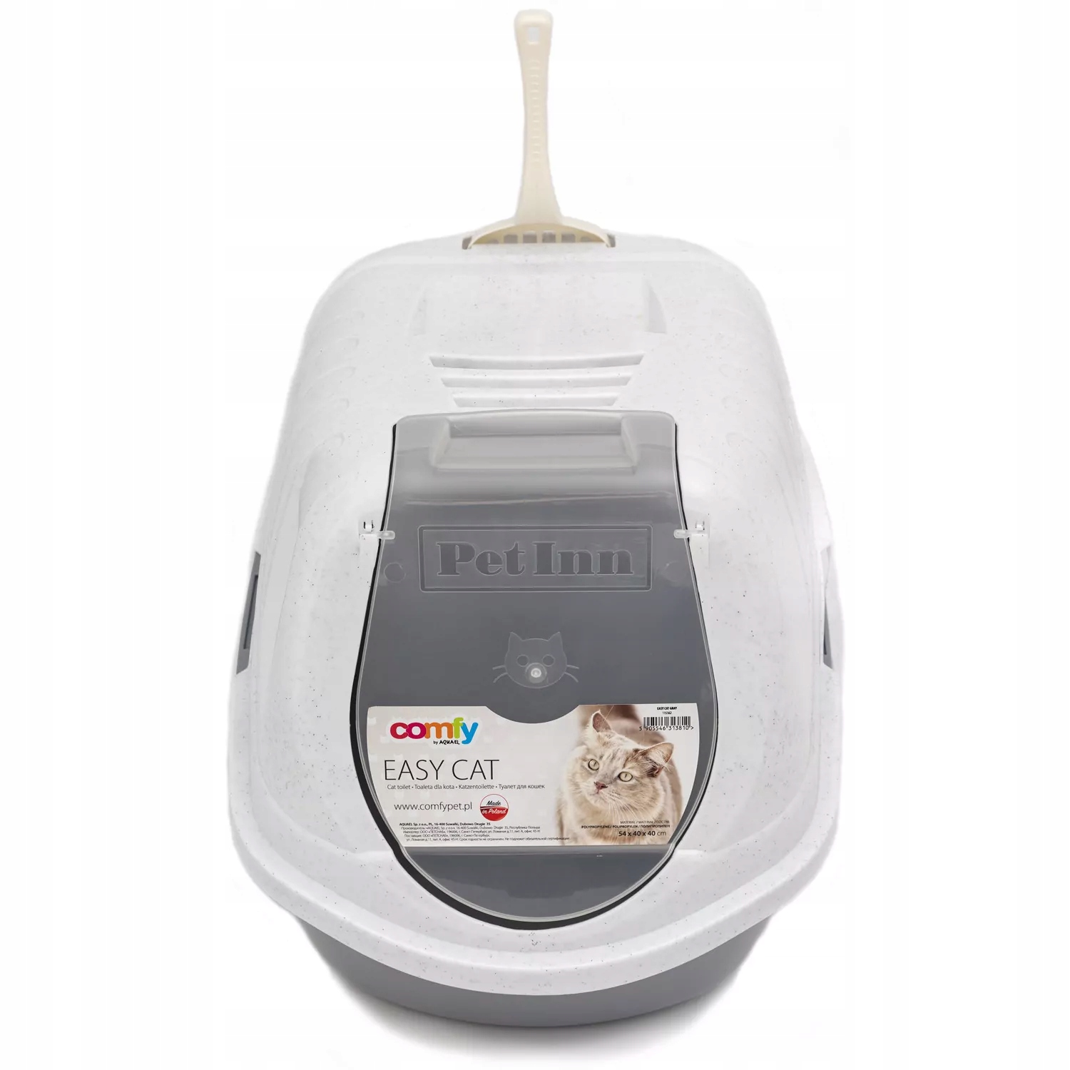 Якщо ви шукаєте найкращі рішення, які полегшать повсякденне життя вашого вихованця під одним дахом, виберіть закритий лоток COMFY EASY CAT. Цей контейнер складається з нижньої глибокої чаші та знімного розширення, яке можна в будь-який момент прикріпити за допомогою спеціальних затискачів. У комплект також входить вугільний фільтр, який ефективно поглинає неприємні запахи екскрементів тварин. Також поруч із ящиком для сміття є лопата для заміни підстилки та видалення відходів. Відкидні дверцята залишаються закритими, коли кішки немає всередині або коли вона використовує лоток.