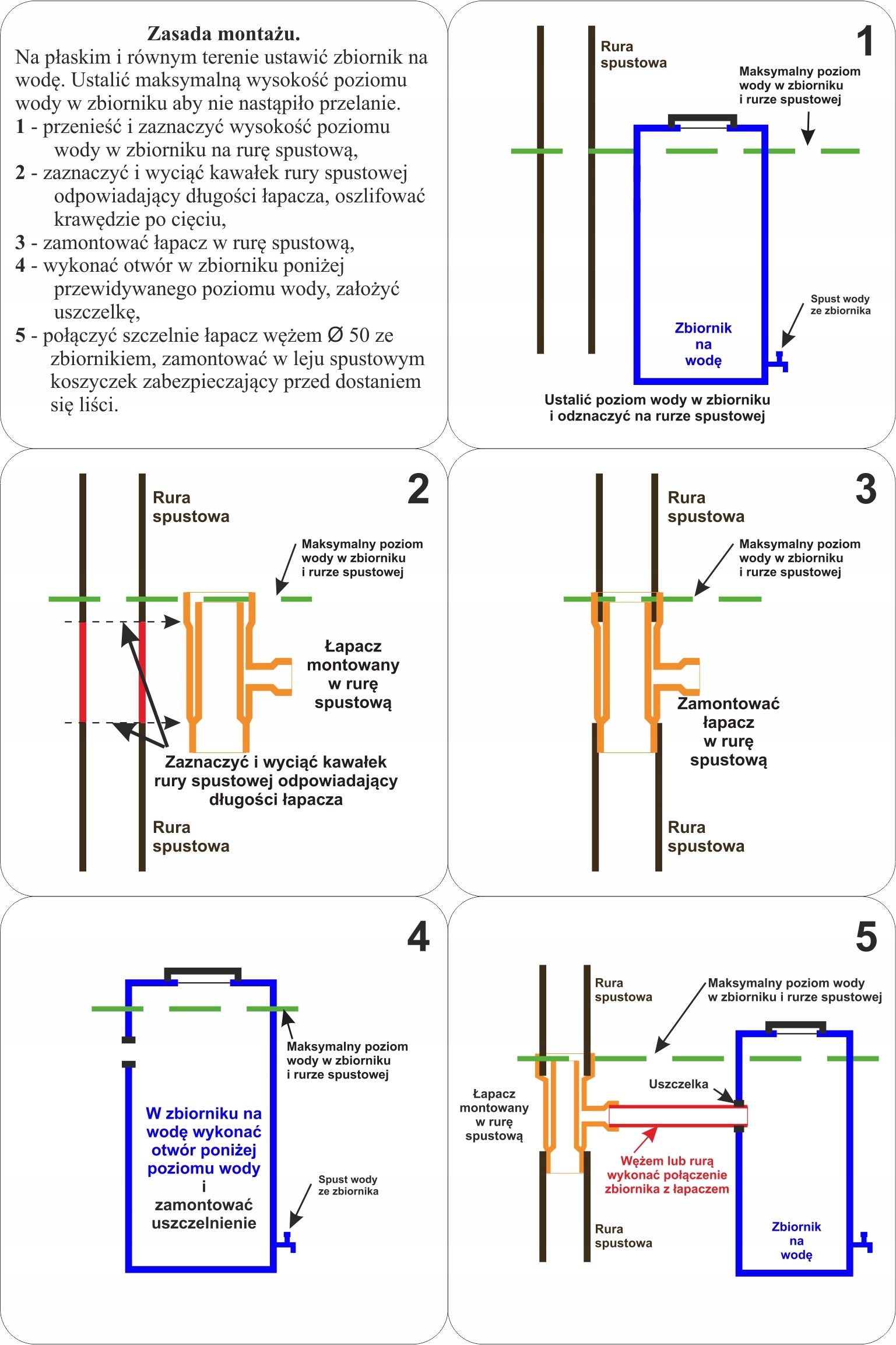 - щільно приєднайте водозбірник до резервуара для дощової води за допомогою шланга Ø50 мм