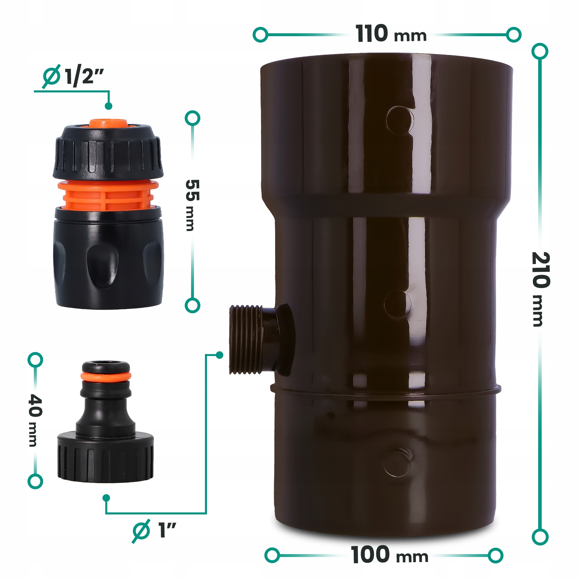 Збірник дощової води 110 мм x 1'' M, коричневий, з підключенням для швидкого з’єднання 1'' GW x SZ і швидкого з’єднання 1/2" W x SZ