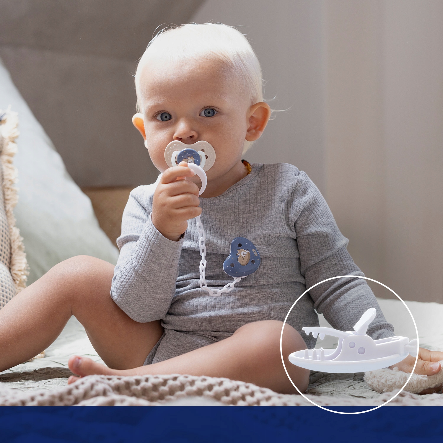 ланцюг пустушника Lovi оснащений дуже практичним кліпом, який дозволяє безпечну та стабільну кріплення до одягу дитини. Ланцюг лохів захищає соски від падіння на землю і втрачаю чи бруду.