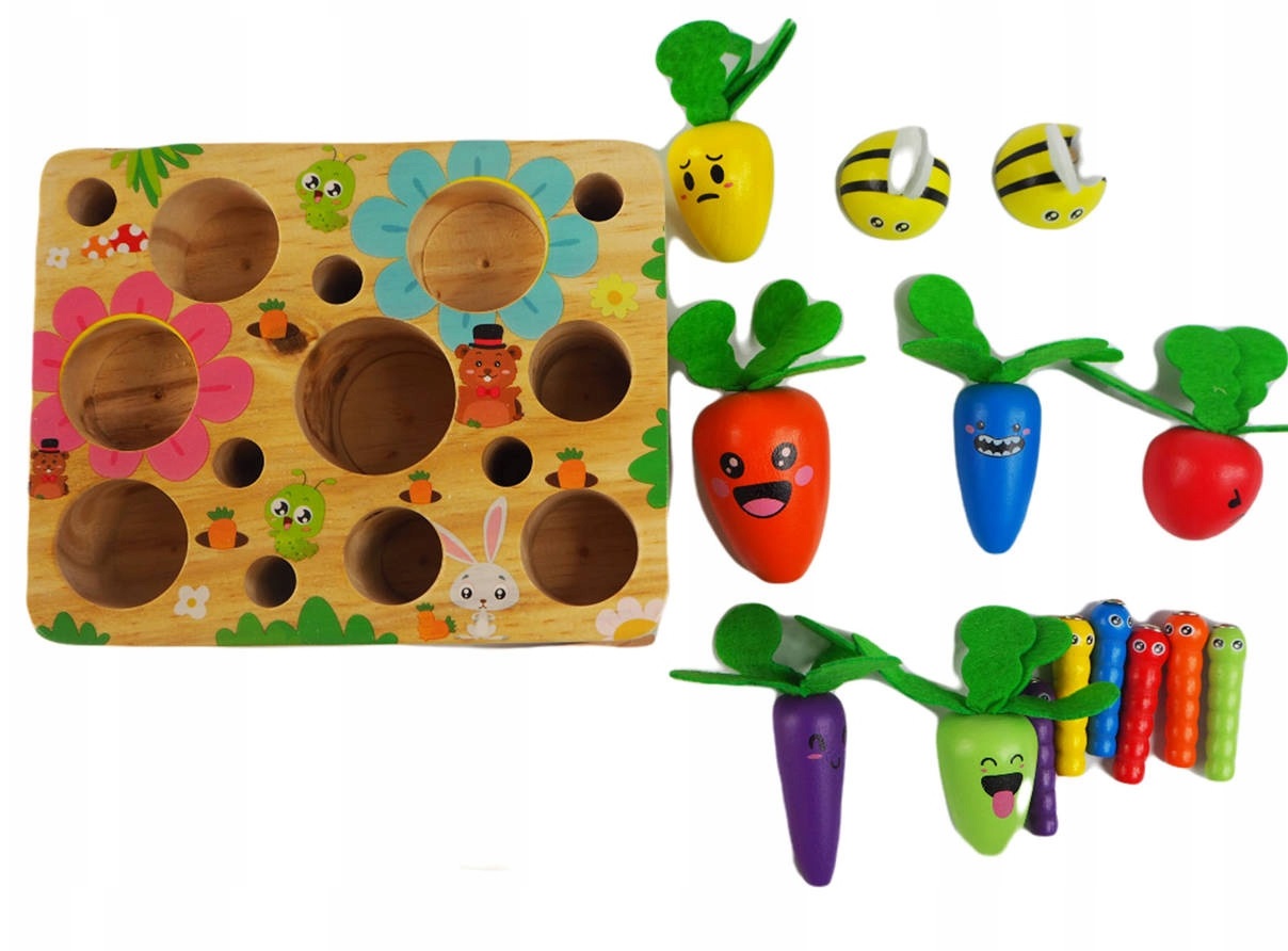 з дерев’яною іграшкою , яка розвиває ефективність ручок, координацію зорового руху та просторову уяву дитини. 4 Вони забезпечать велику забаву для вашої дитини протягом багатьох годин. Гра складається з дерев’яної коробки з 14 отворами , в яких приховані глисти та овочі. Спочатку дитина навчиться витягувати їх з отворів, пізніше, коли він зробить цю майстерність добре, вона посадить їх назад. Це не так просто, як здається, і вимагає великої уваги та точності . Гра ідеально розвиває рухові навички, наполегливість та терпіння.