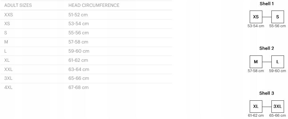 - 3 розміри корпусу: XS-S / M-L / XL-3XL (зовнішній розмір шолома змінюється)