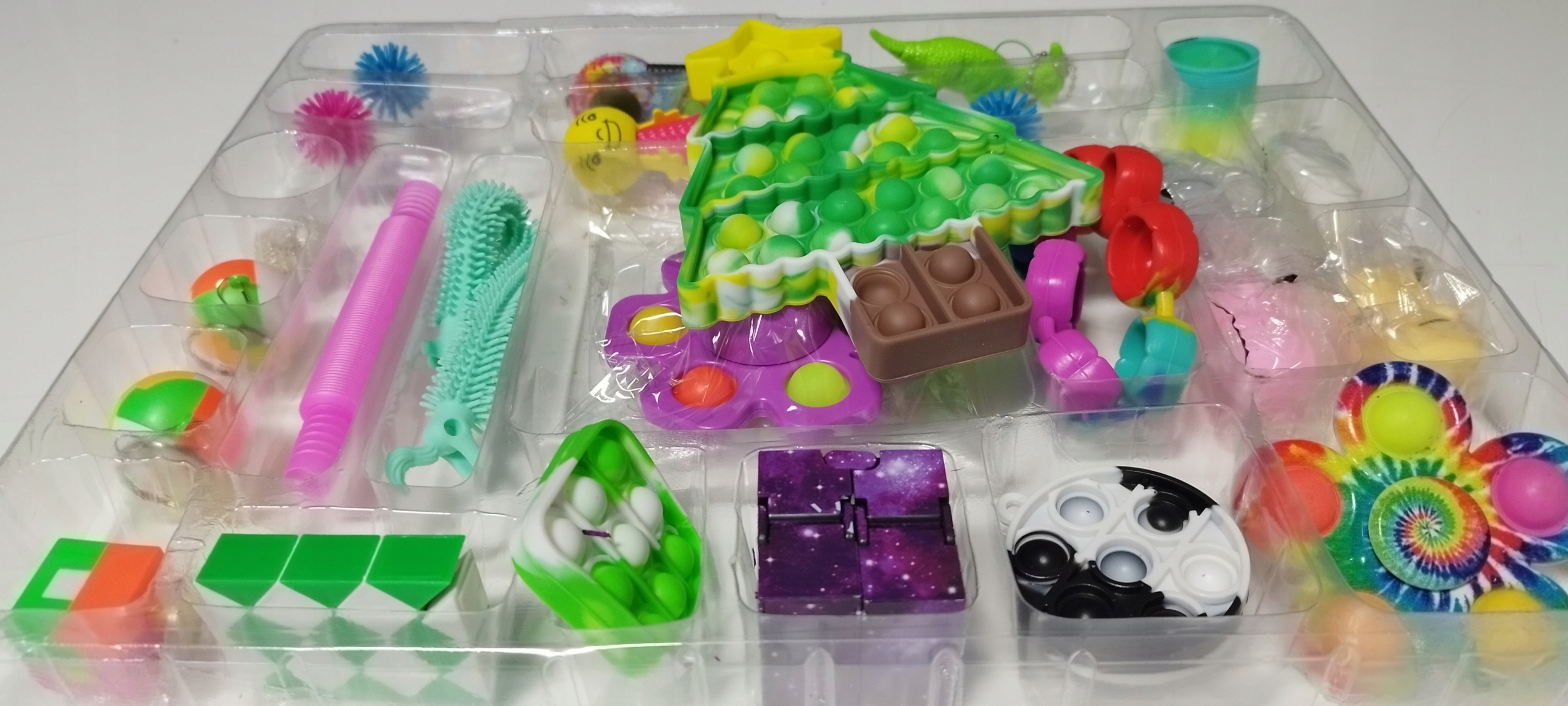 У коробці містяться різні типи іграшок, які допомагають зняти стрес і хвилювання. У набір входять такі іграшки, як бульбашкова ялинка Pop It, сенсорні брелоки, спінер та багато інших аксесуарів. Іграшки можуть повторюватися, але відрізнятимуться формою чи кольором.