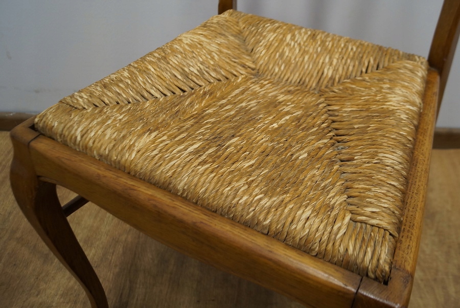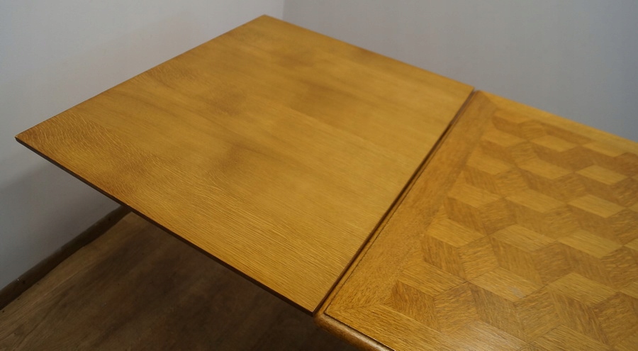 Стіл розсувний, дуже міцний і стійкий, з інкрустованою стільницею. Сидіння обшиті плетеною тростиною, спинки фантастичної форми.