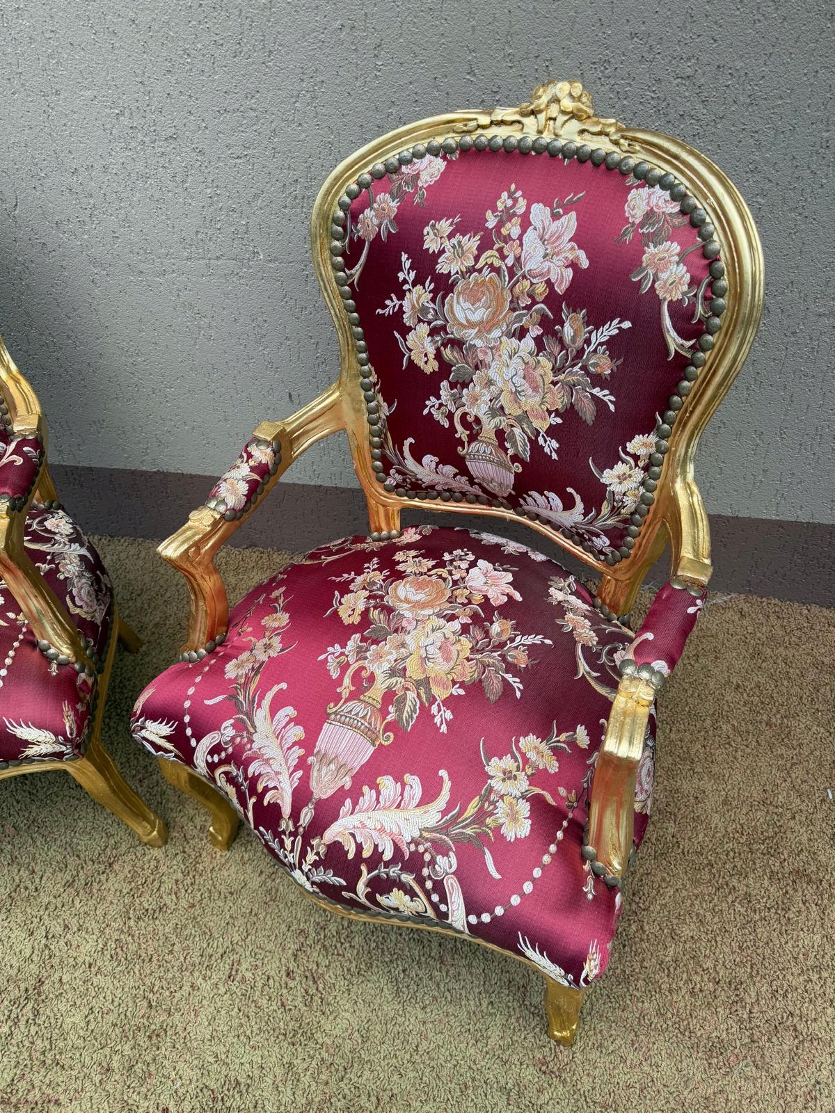 ДЕЛІКАТНЕ ФРАНЦУЗЬКЕ КРІСЛО В СТИЛІ LOUDWIK З ПРИКРАШЕНОЮ КВІТКОВОЮ ОБбивкою ТА РІЗЬБЛЕНИМ ДЕРЕВ’ЯНИМ КАРАМОМ ЗОЛОТОГО КОЛЬОРУ, ПОЗОЛОЧЕНОГО ДЕРЕВА МАТЕРІАЛ ПЕЛЕЮСТКІВ