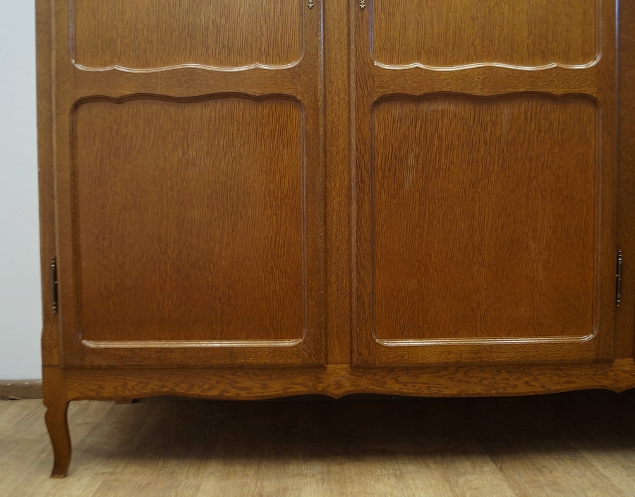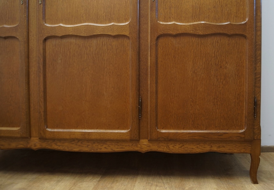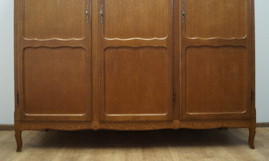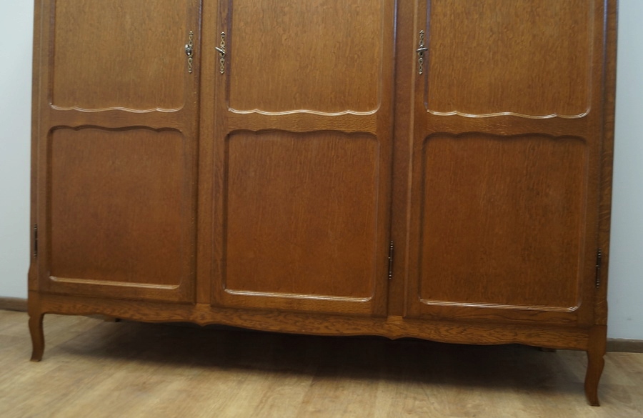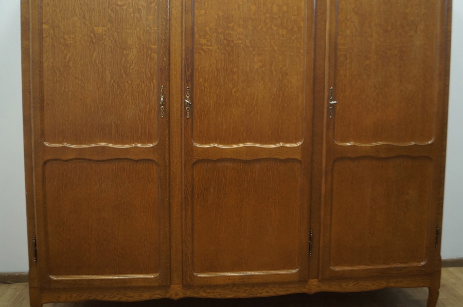 Шафа тридверна. Предмет меблів прикрашений декоративними панелями і спирається на ніжки кабріола. Гора дугоподібної форми.