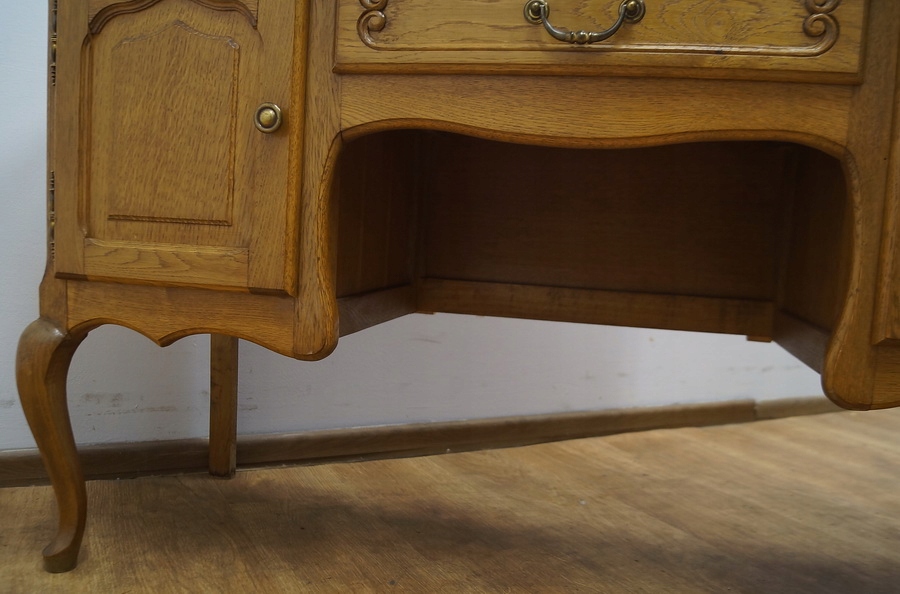 Дві дверцята і ящик. Меблі, прикрашені декоративним різьбленням. На стільниці велике дзеркало.