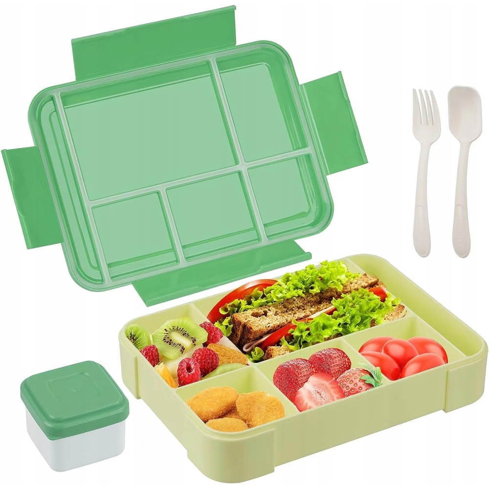 - 🍛З відділеннями: контейнер для обіду на 1300 мл, 5 відділень, з окремим контейнером для соусу.