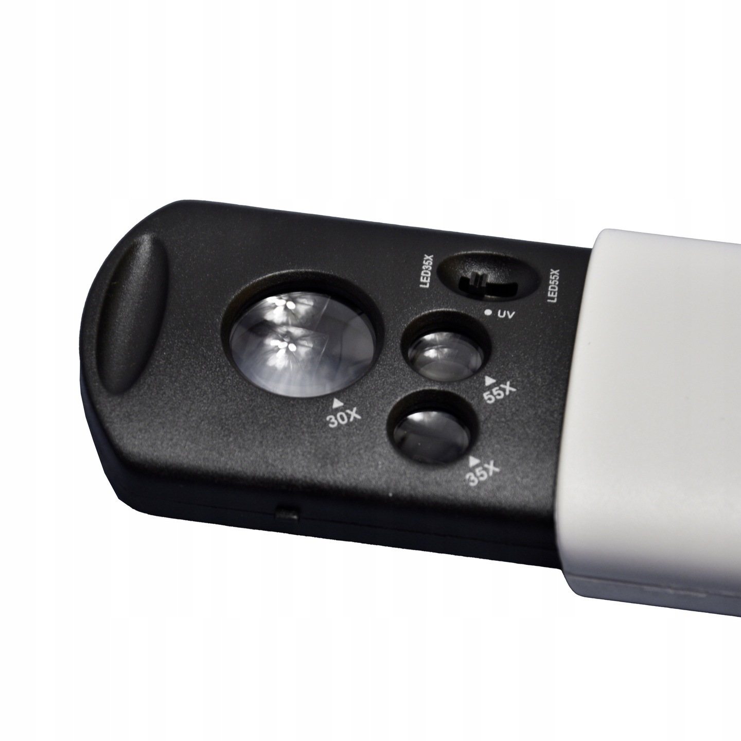 - Професійна світлодіодна лупа для читання з трьома лінзами 55x, 35x, 30x і додатковою функцією ультрафіолетового випромінювання