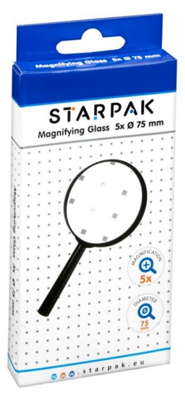 Збільшувальне скло Starpak у міцній оправі, стійкій до подряпин і пошкоджень скла. Зручна і ергономічна ручка. Перегляньте також інші продукти Starpak! Лупа 5-кратне збільшення, діаметр 75 мм. Продукт упакований в картонну коробку. Призначено для дітей віком: 3+. Розміри упаковки (висота x ширина x глибина) [см] 18x8x1,5.